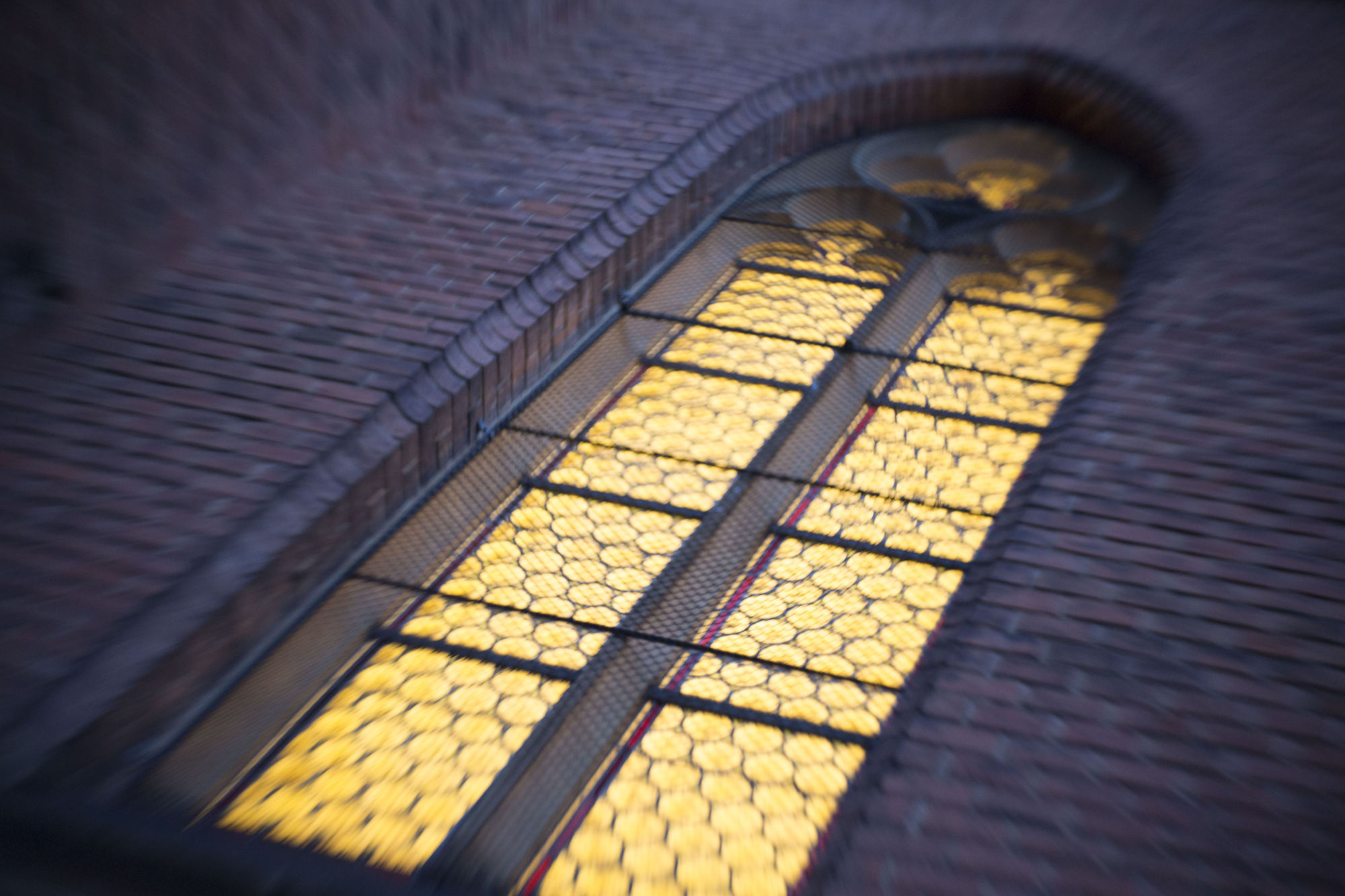 Kostelní okno, neomítnuté cihlové zdivo se zvláštním způsobem jakoby míhá.