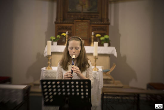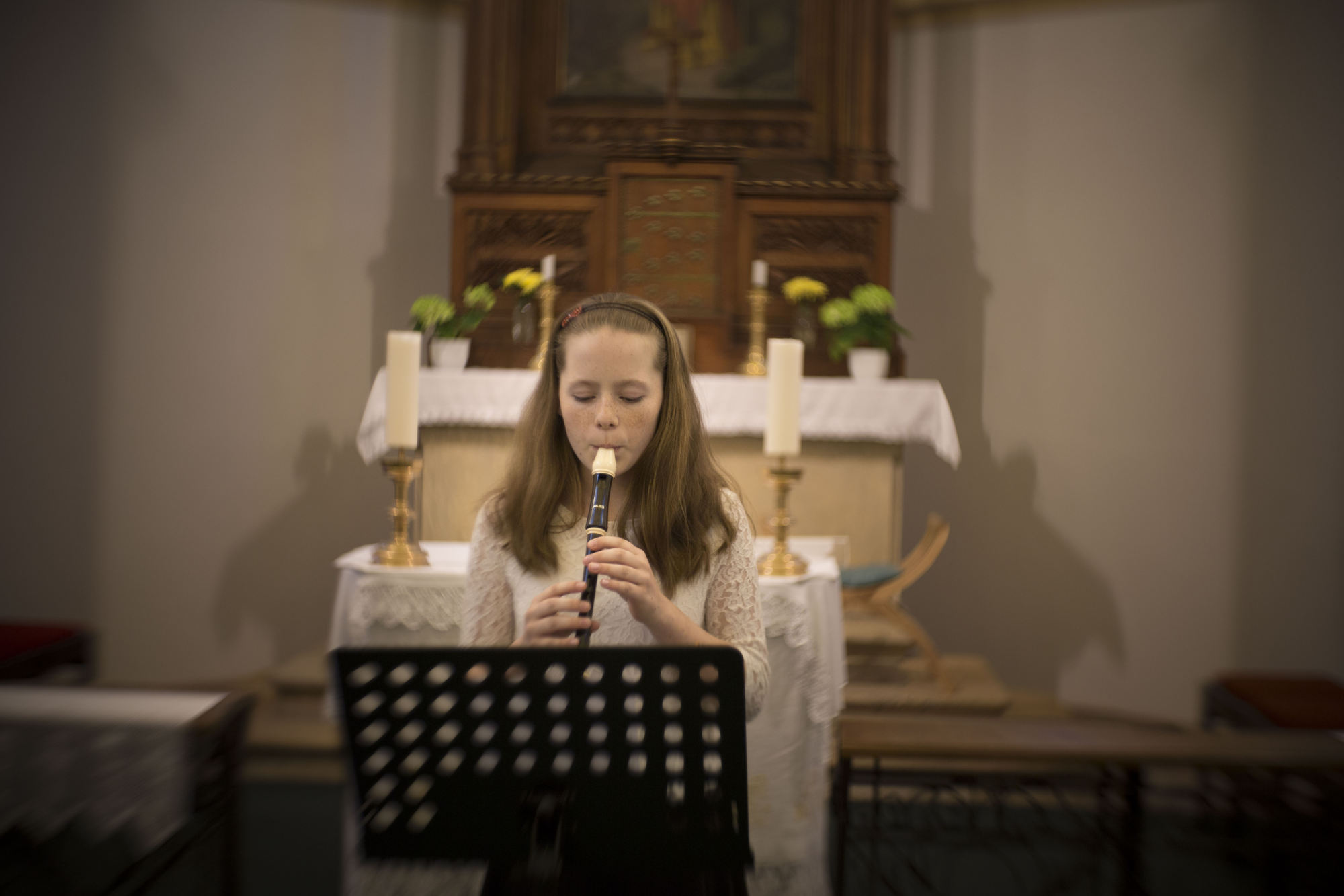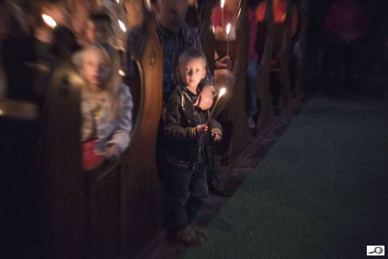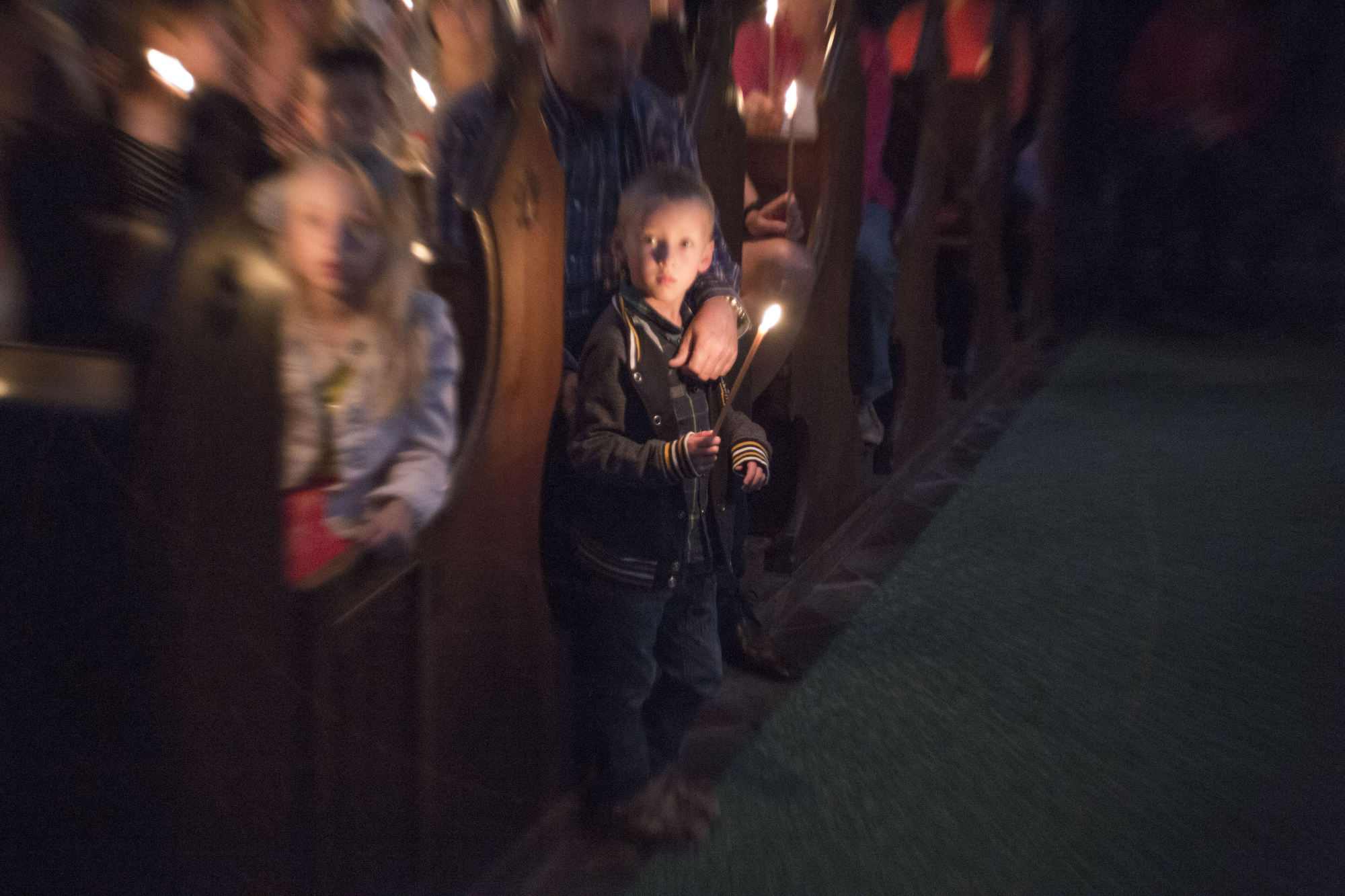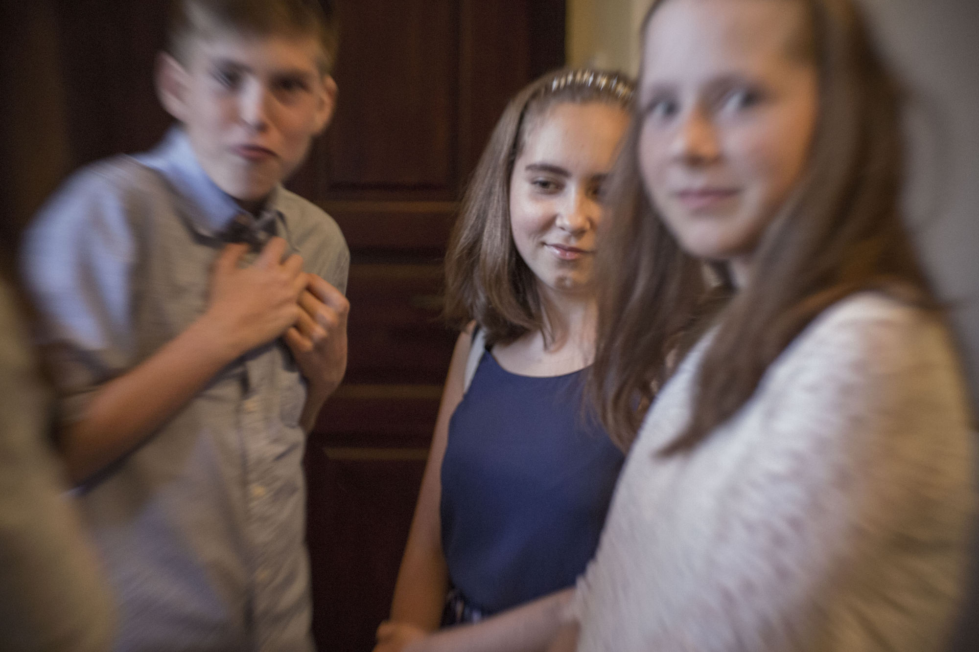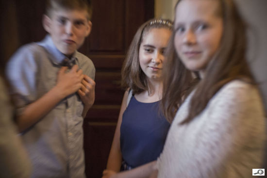 Děti v sakristii se chystají na vystoupení. Teď si ne všimly, že je fotím. Na hladkých plochách ty efekty nejsou tak výrazné.