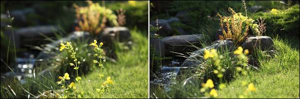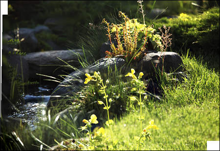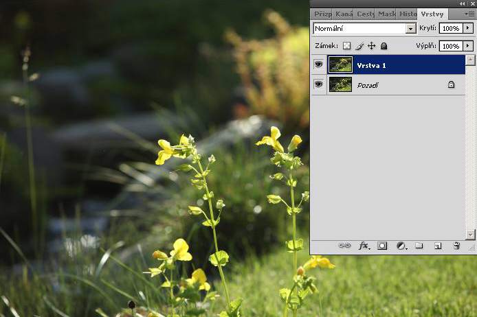 Pozornému zraku neuniknou problémy, vyplývající z ostrosti masek. Je to patrné hlavně na potůčku v levé spodní části, kde najednou je ostrý přechod z ostrosti do neostrosti. Masky jsou tak napasované na sobě, že jsem nepřišel na způsob, jak je rozostřit nebo upravit, abych obtíž řešil. Nenašel jsem jiný způsob, než vymaskované vrstvy nejdřív sloučit a pak pod tuto sloučenou vrstvu vložit původní obrázek s žádoucím pozadím a do něj se natvrdo progumovat. Už slyším, že mě někdo nazve čunětem, ale funguje to a to pokládám za hlavní.