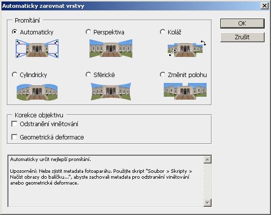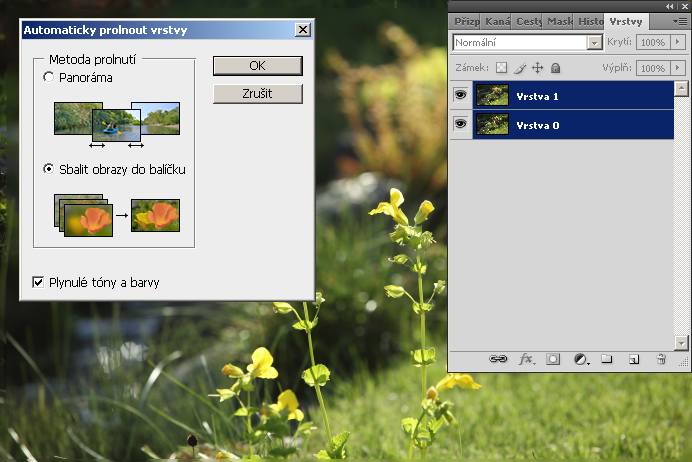 Nad ničím nepřemýšlejte, nechte výchozí nastavení automaticky a odklepněte OK. Vrstvy se jaksi spasují na sebe. V dalším kroku volíme funkci úpravy – automaticky prolnout vrstvy, která je v menu hned pod tím. Zde volíme sbalit obrazy do balíčku, jak je to vidět na ukázce, na níž jsou patrné obě vysvícené vrstvy.