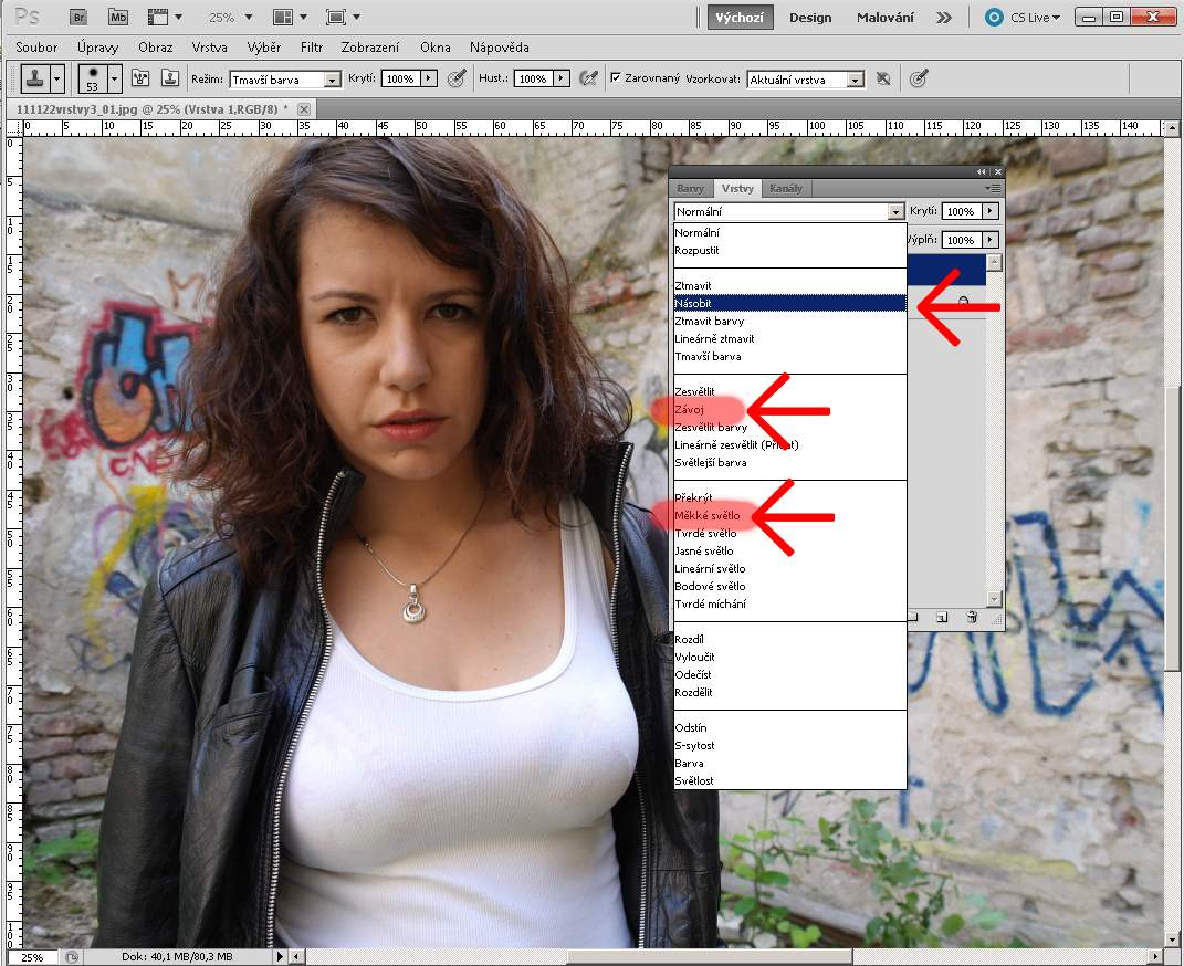 Ty druhé dvě šipky ukazují na další dvě prolnutí, které v praxi často užíváme. Závoj znamená zesvětlení a Měkké světlo paradoxně zvýšení kontrastu, vyzkoušejte si to, nezanechává to na obrázku nic škodlivého. Teď se ale budeme zabývat prolnutím Násobit.