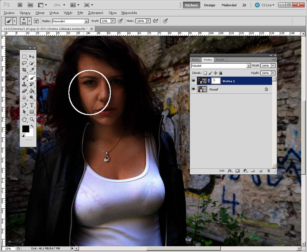 Kolečko naznačuje stopu štětce. Má velké rozpití (tvrdost 0 %), aby nezanechával stopu. No a mohu jím pracovat do aleluja. Černá zakrývá tmavou vrstvu, čili fakticky zesvětluje, protože zakrytými plochami horní ztmavené vrstvy vidíme dolů na spodní vrstvu, která je světlá. Jakmile ale mám pocit, že jsem to přehnal, klávesou X přehodím černou a bílou barvu a bílou barvou (která je teď v popředí) vše napravím. Lze jít i do velkých detailů – např. zvýraznění očí. Štětec (klávesa B = brush, anebo ho volíme na paletě nástrojů) může mít ostrost na úrovni jednotlivých pixelů!