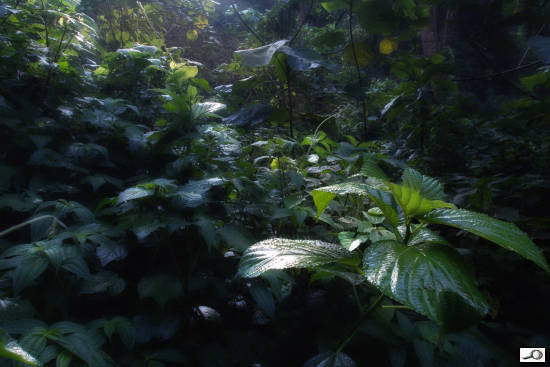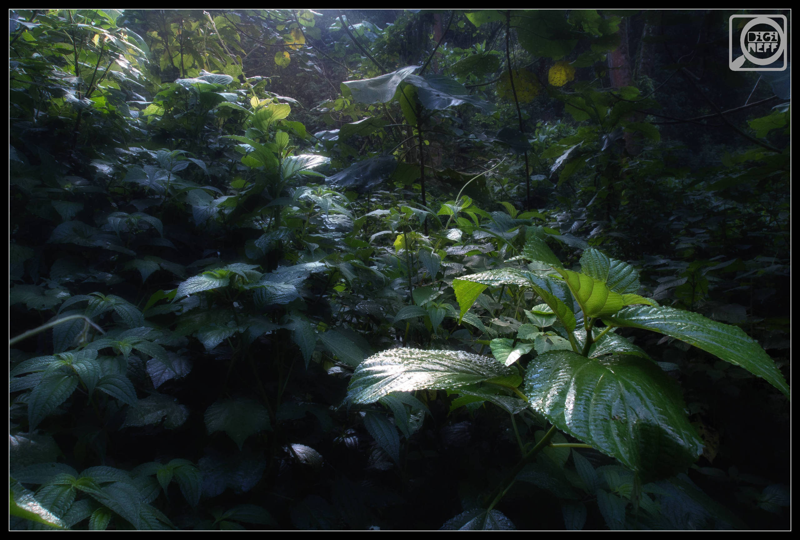 Markantem může být prakticky cokoli. Toto je snímek z deštného pralesa v Ugandě. Je tam zmatek – jako v pralese, není čeho se chytit. Opět se ale osvědčil trik s přiblížením k objektu, teď to jsou široké mokré listy. Tím líp, když jsou osvětlené – světlé plochy v tmavém prostředí přitahují oko. Dokonce i osvětlená skvrna může posloužit jako markant! Zde je fotka postavena na pruhu světla v úhlopříčce shora dolů doprava – končí na markantu.