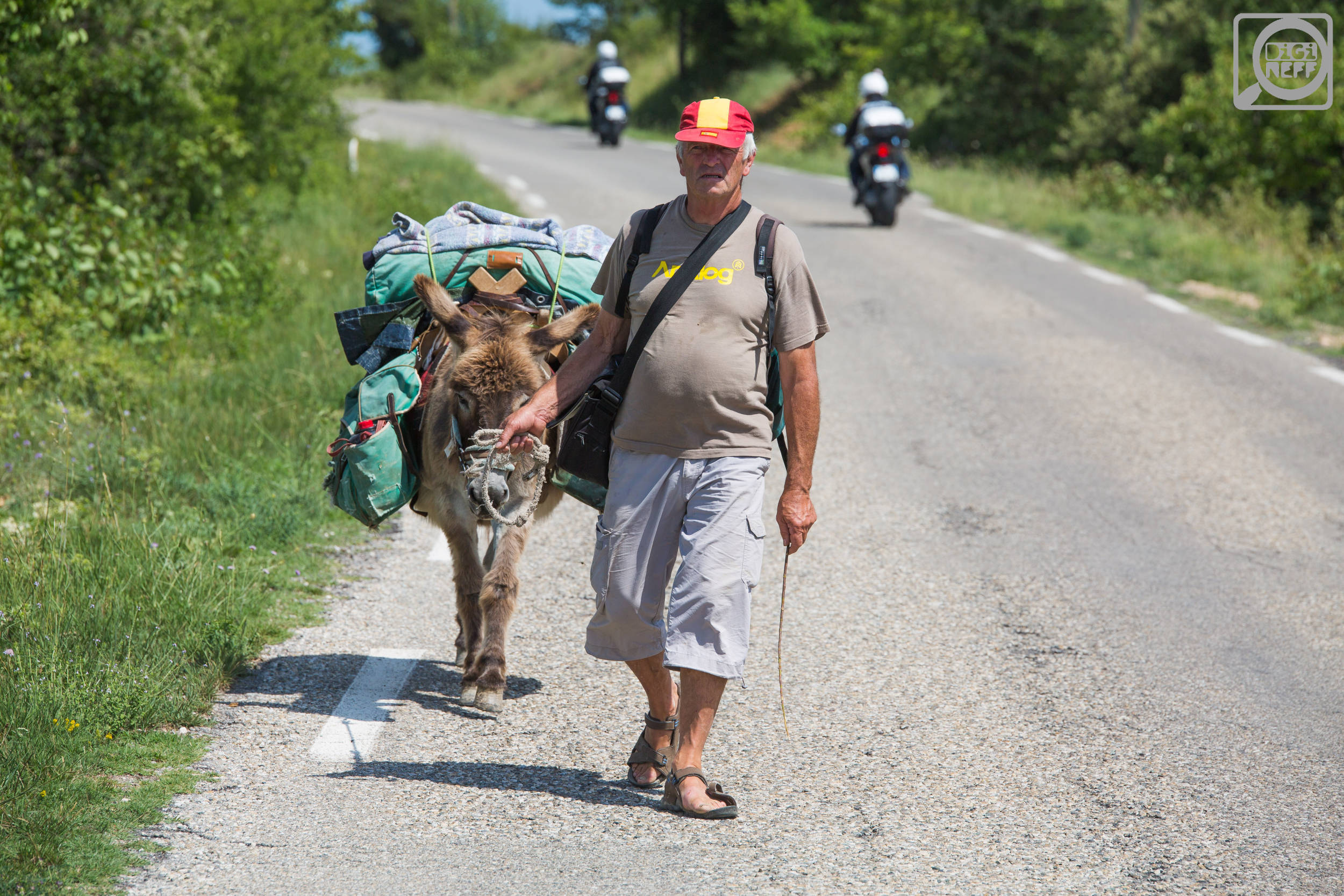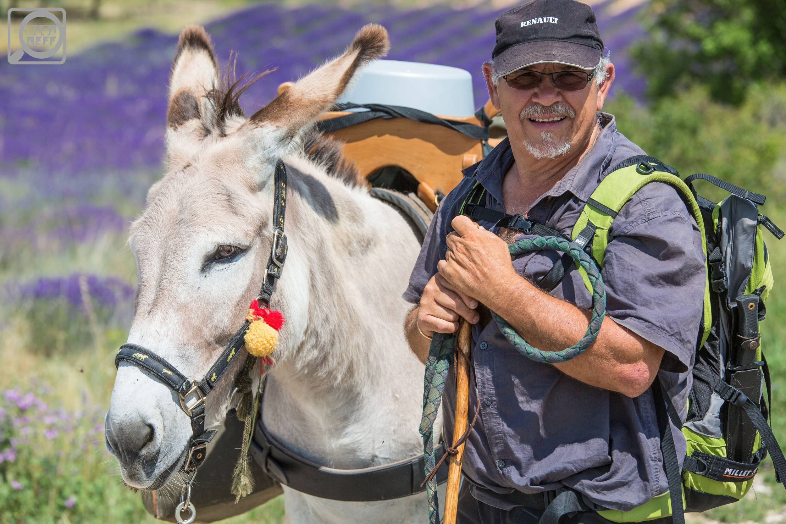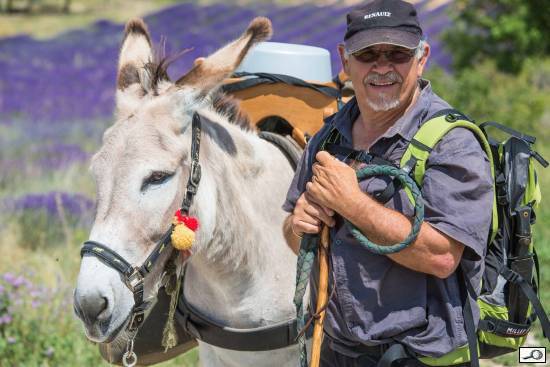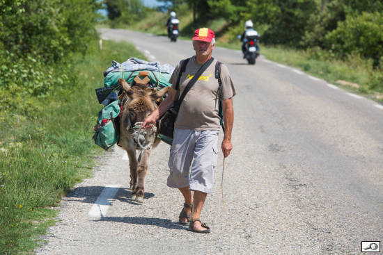 Fotili jsme minulý týden v Provenci levandulová pole. No a najednou – vyloupli se na silnici dva chlapíci, kteří putují po Francii na oslu! Hned jsem popadl aparát a chlapíka střihnul, počkal jsem si na chvíli, kdy kolem jedou motorkáři (situační kontrast nikdy neškodí 🙂 ).