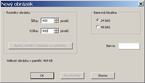 Nejdříve si vytvoříme plátno, na němž budeme pracovat (Soubor -> nový a zde nastavíme výšku a šířku.