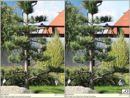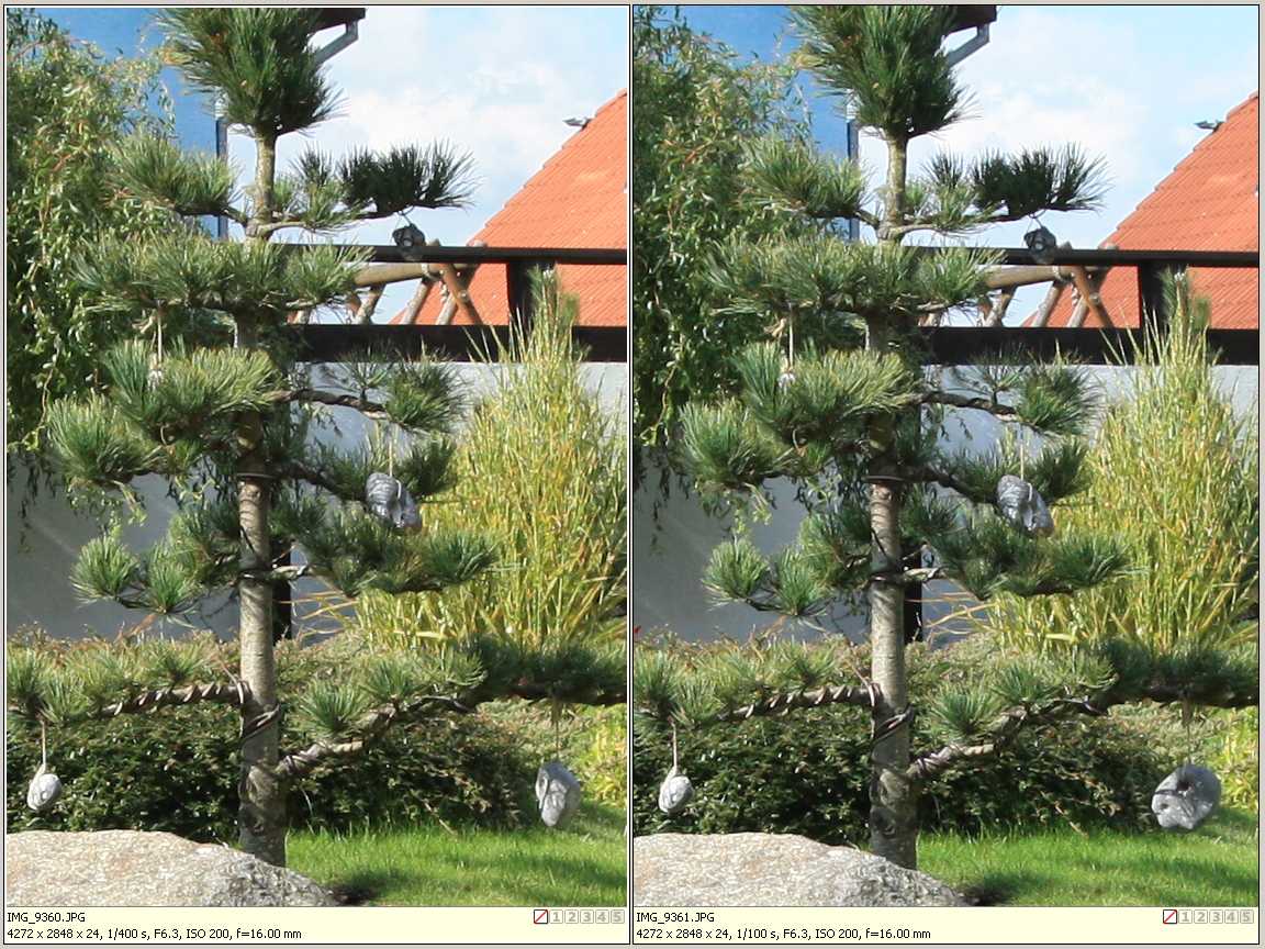 Nejdříve jsem zkoušel ND 0.6 filtr. Ten je stejnoměrně zbarvený a vede ke snížení propustnosti světla o 2 EV. Zkouška dopadla dobře. Na ukázce vidíte srovnání, vlevo bez filtru, vpravo s filtrem. Obrázky jsou exponované různě, nicméně ve výsledku jsou absolutně stejně kryté a stejně ostré. Jde o výřez 1:1, pořízeno Canonem EOS 450D.
