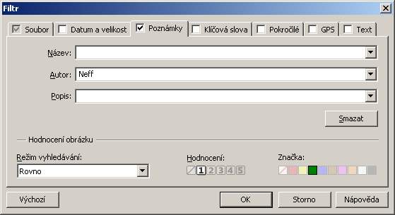 Tady je zaškrtnuto: vyber snímky s autorem Neff, hodnocením 1 a značkou zelená. Z celkového množství ZPS vybere jen ty snímky, které odpovídají těmto kritériím. Ty pak lze přepsat do jiného adresáře – anebo hromadně přejmenovat, aby se evidentně odlišily od těch zbývajících. To je velmi dobré opatření, protože fotky zůstanou v původním adresáři a přitom je ten výběr zřetelný. Navíc ho můžeme doplňovat dalšími fotkami.