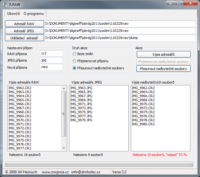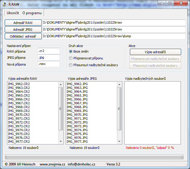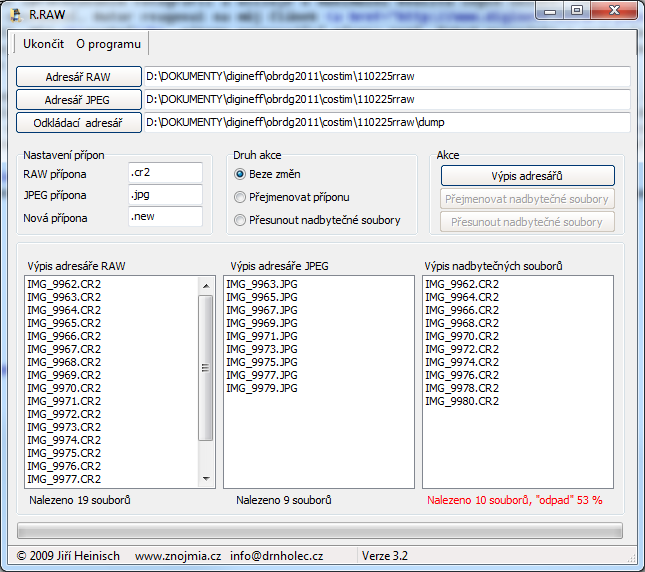 Stručně řečeno, myslím že má smysl když už tak fotit buď jenom v RAW anebo když se nehodlám s fotkami párat, tak jenom v JPEG. Když jsem v RAW formátu, vyberu nejlepší, smažu co se mi nelíbí a pak za dlouhých zimních večerů při konverzi edituji. Nicméně nikomu to nevnucuji a je plno lidí fotografujících na oba formáty souběžně. Pro ně (a nejen pro ně, jak uvidíme) napsal pan Heinisch svoji pomůcku, která se dá stáhnout na slunecnice.cz/sw/rraw/. Je to maličký freewarový prográmek, odkazuje se v něm na server znojmia, nicméně návod na prográmek je pod položkou O programu. Z pokusných důvodů jsem nacvakal sérii souběžných formátů. Stáhnul jsem je do jednoho adresáře. zřídil si odkládací adresář DUMP, do něho spadnou vyřazené snímky a prográmek reagoval takto: ![]() Zde nutno podotknout, že je třeba napsat správnou příponu RAW (zde je canonská CR2, Nikon má NEF atd.) a je třeba zadat všechny tři adresáře, v tomto případě je pro CR2 i JPEG adresář shodný. No a potom někde – třeba v Zoneru, vyřadím nepotřebné snímky a srovnám výsledek: ![]() Vyhodil jsem každý druhý JPEG a vida, R.RAW našel odpovídající RAWy a nabídl je ke zpracování. To je jednoduché, kliknu na volbu přesunout nadbytečné soubory a prográmek to udělá, šoupne to do adresáře, který jsem definoval jako odkládací. ![]() Pan Heinisch navrhuje ve svém mailu svůj způsob, cituji: