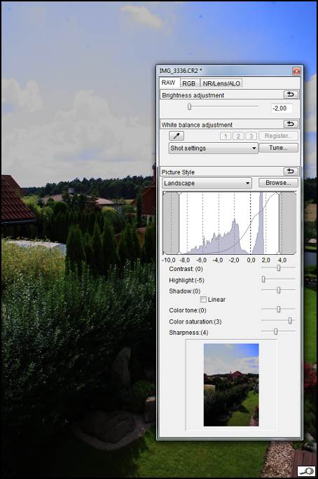 Situaci lze řešit přechodovým filtrem. Toto je výsledek takového pokusu, jde o filtr od firmy LEE, intenzita 0,5. Je to prostředek používaný velmi často, nicméně mám několik drobných výhrad. Je to další optický prvek v systému. Filtry LEE patří k absolutní špičce, takže nedochází k nějakým problémům s kresbou, nicméně přece jen jde o zařízení poměrně rozměrné (jde o obdélníkové zasunovací filtry). Vraťme se tedy k původnímu přepálenému snímku. Pořídil jsem ho klasickým přístrojem Canon 5D, kromě JPEG i v RAW formátu. Na první ukázce je zpracování ve firemním Canon Digital Photo Professional softwaru.