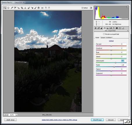 Do třetice jsem vyzkoušel Camera Raw od Adobe. Při zpracování snímků z Canonu se mi v mnoha případech více osvědčil onen Digital Photo Professional, ale pro obnovu mraků byl lepší Camera Raw. Modrá chtěla trochu úpravy, nicméně mraky prokoukly velmi dobře.