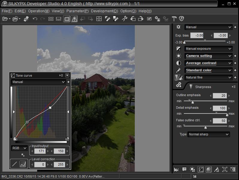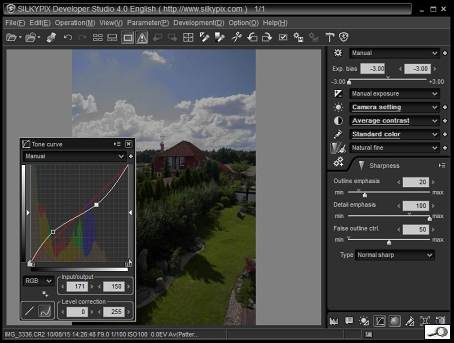 Druhý experiment jsem podnikl se zajímavým softwarem Silkypix. Ten se dodává k přístrojům Panasonic, ve funkčně omezené verzi vybavené pouze knihovnami Panasonic; lze koupit verzi 4.0, která umí skoro 200 různých fotoaparátů, včetně Canonů. Nicméně výsledek nebyl o moc lepší než v předchozím případě: