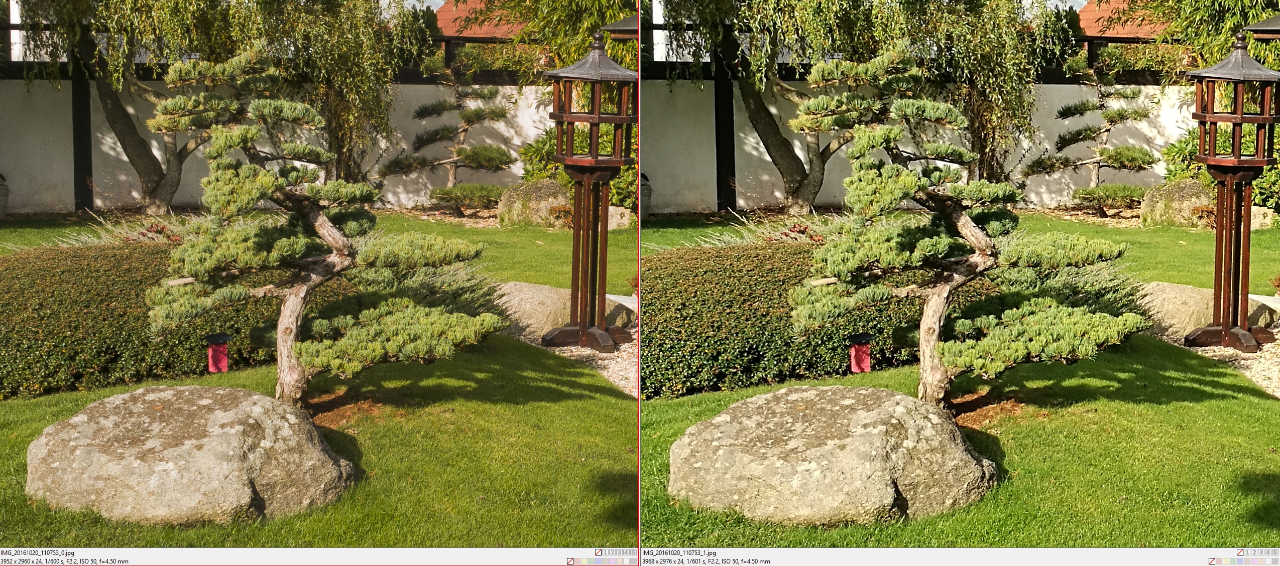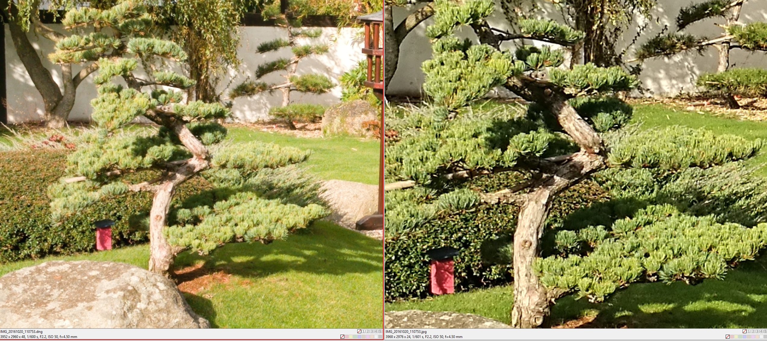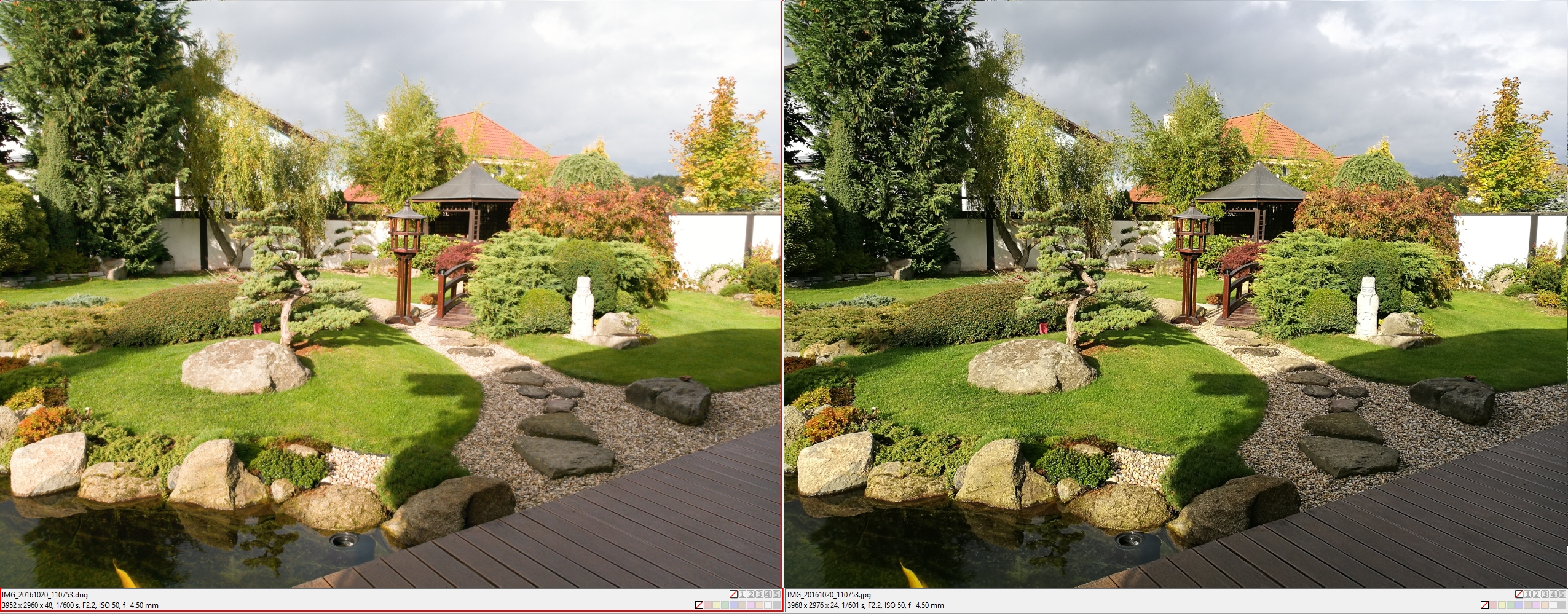 Vlevo je DNG a vpravo JPEG. Nemusíte ani proklikávat, abyste měli jasno: ten vpravo JPEG je lepší, ten nalevo DNG je chcíplotina s přepálenými jasy.