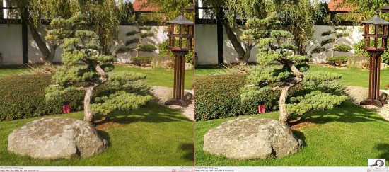Zvětšíme srovnání na 200% zobrazení. RAW vlevo, JPEG vpravo. Ten JPEG je větší než náhled DNG. To je obvyklé, jen prestižní foťáky, např. Canon a Nikon, mají náhledy RAWu v plné velikosti. Ale i tak je vidět, že je ten JPEG výraznější.
