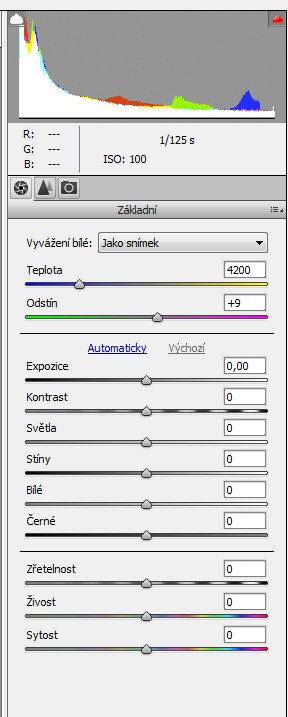 Teplota, tím je míněna teplota v Kelvinech. Když obrázek otevřeme, objeví se nám v té podobě, v jaké vznikl, tedy respektuje všechna nastavení fotoaparátu. Takže v dané chvíli je teplota 4200 K, tak to můj Canon nastavil, a odstín je +9. Zde jen podotknu, že v Camera RAW (a i jiných konvertorech) lze ve velkém rozsahu měnit barevnou teplotu. Tahle fotka je ale v tomto ohledu bez problému, takže na táhla Teplota a Odstín nebudeme sahat.