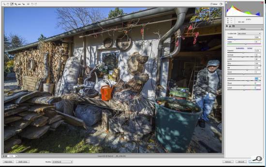 Obrázek se zásadně změnil a pohnula se všechna jmenovaná táhla. Automatika zvedla expozici na +0,7, snížila kontrast na -10, stáhla světla na -50, zvedla stíny na +50 a bílé posunula do +27 a černé do +12. Co se to stalo? No, nám šlo hlavně o projasnění těch temných stínů. Proto ten posun expozice do plusu a zároveň snížení kontrastu, už jsme si přece všimli, že kontrast má na ty stíny vliv. Jenže on byl pak ten obraz jaksi mdlý. Proto ten posun bílé a černé – je to podobná funkce, jako v obyčejných Úrovních bílý a černý jezdec. Černá určí, na jaké úrovni jasů bude hodnota nula: když nám automatika nastavila černou na +13, znamená to, že obraz ve stínech zesvětlel, že se černý bod posunul o 13 jasových stupňů ke světlejší tónině.