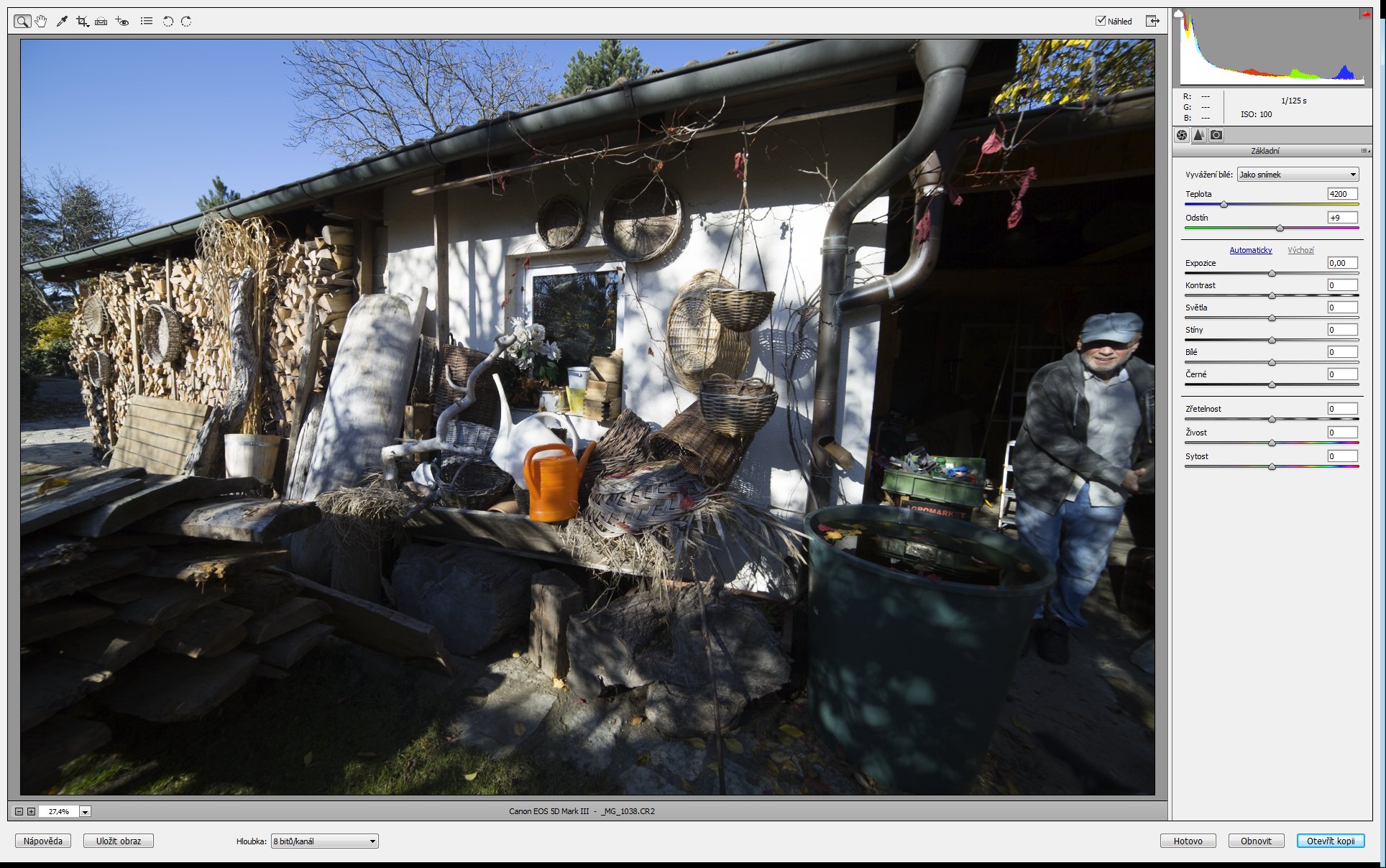 Teplota, tím je míněna teplota v Kelvinech. Když obrázek otevřeme, objeví se nám v té podobě, v jaké vznikl, tedy respektuje všechna nastavení fotoaparátu. Takže v dané chvíli je teplota 4200 K, tak to můj Canon nastavil, a odstín je +9. Zde jen podotknu, že v Camera RAW (a i jiných konvertorech) lze ve velkém rozsahu měnit barevnou teplotu. Tahle fotka je ale v tomto ohledu bez problému, takže na táhla Teplota a Odstín nebudeme sahat.