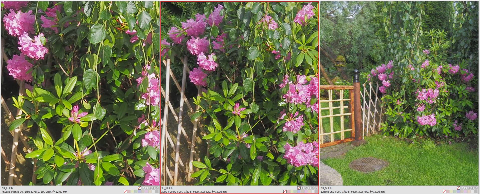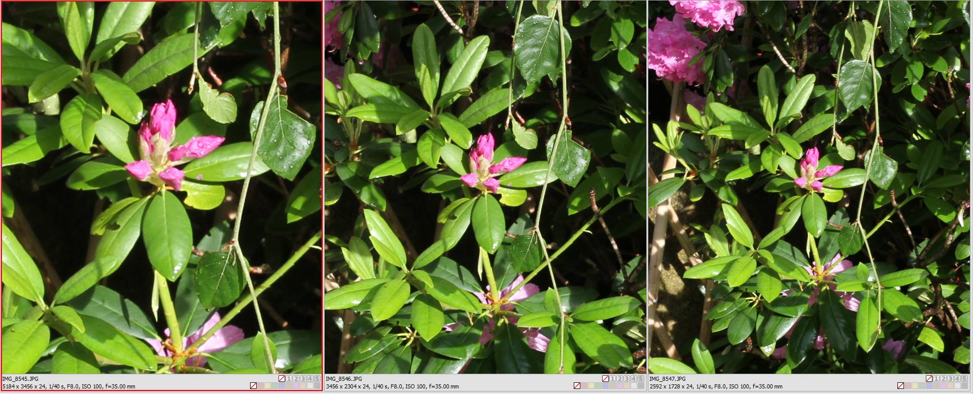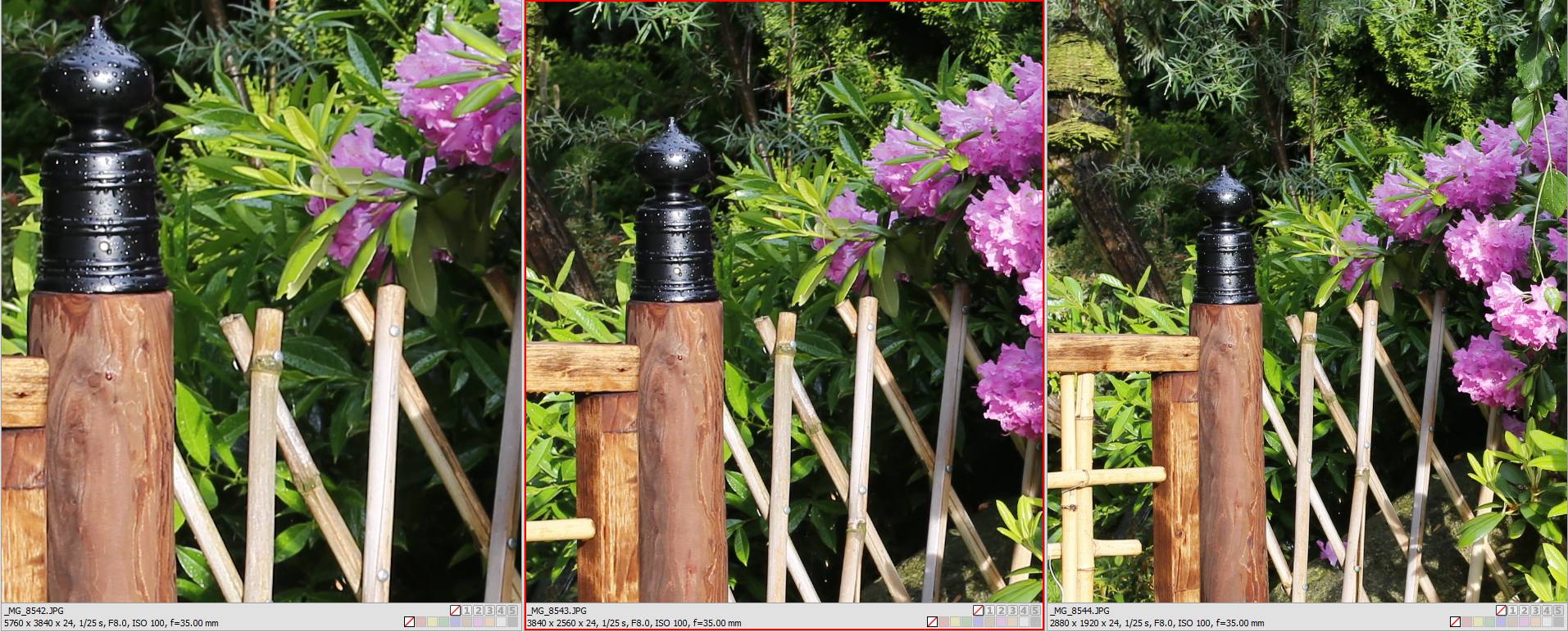 Začněme od plnoformátu a budu vždy srovnávat jen velký a střední rozměr. Toto je srovnání výřezu udělaného tak, aby pokryl shodnou plochu obrazu. Vlevo je plný formát, vpravo střední, tedy zmenšen a vpravo malý: