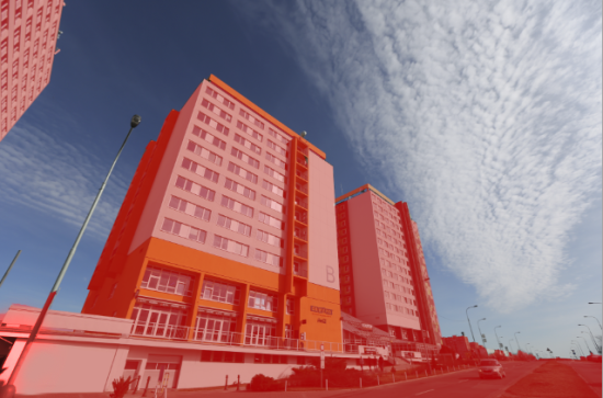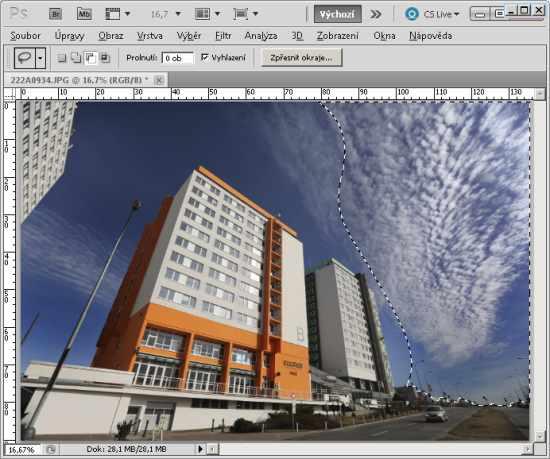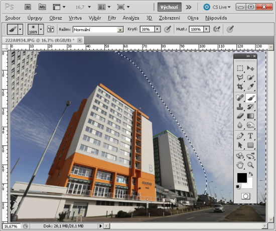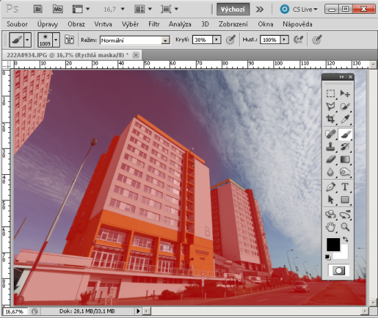 Photoshop zná dva druhy masek, masku vrstvy a rychlou masku. Jmenuje se to podobně, je to ale něco úplně jiného. Rychlá maska je v podstatě jen vizualizace výběru. To co je uvnitř výběru je v režimu Rychlé masky plně barevné, vše co je mimo je červené s 50% krytím (pokud si to nezměníte, ale takhle je to ve výchozím nastavení PS). Tento článek předpokládá, že víte co je to výběr a jak se výběr dělá. Ikonka pro rychlou masku je úplně dole na paletě nástrojů, je to obdélníček s kolečkem uprostřed. Jakmile v PS uděláte výběr kterýmkoli nástrojem, lasem, nebo pravoúhlým výběrem, kouzelnou hůlkou nebo štětcem pro rychlý výběr, získáte to, čemu se říká „pochodující mravenci“. Výběr je vymezen čárkovanou linií, která se pro názornost pohybuje. V téhle fotce jsem dal do výběru nebe nad budovami. Budovy se mi líbí po stránce světlosti a barev, nebe bych rád zvýraznil.