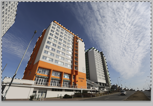 Photoshop zná dva druhy masek, masku vrstvy a rychlou masku. Jmenuje se to podobně, je to ale něco úplně jiného. Rychlá maska je v podstatě jen vizualizace výběru. To co je uvnitř výběru je v režimu Rychlé masky plně barevné, vše co je mimo je červené s 50% krytím (pokud si to nezměníte, ale takhle je to ve výchozím nastavení PS). Tento článek předpokládá, že víte co je to výběr a jak se výběr dělá. Ikonka pro rychlou masku je úplně dole na paletě nástrojů, je to obdélníček s kolečkem uprostřed. Jakmile v PS uděláte výběr kterýmkoli nástrojem, lasem, nebo pravoúhlým výběrem, kouzelnou hůlkou nebo štětcem pro rychlý výběr, získáte to, čemu se říká „pochodující mravenci“. Výběr je vymezen čárkovanou linií, která se pro názornost pohybuje. V téhle fotce jsem dal do výběru nebe nad budovami. Budovy se mi líbí po stránce světlosti a barev, nebe bych rád zvýraznil.