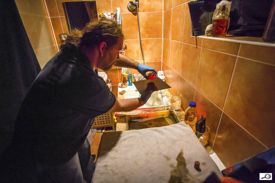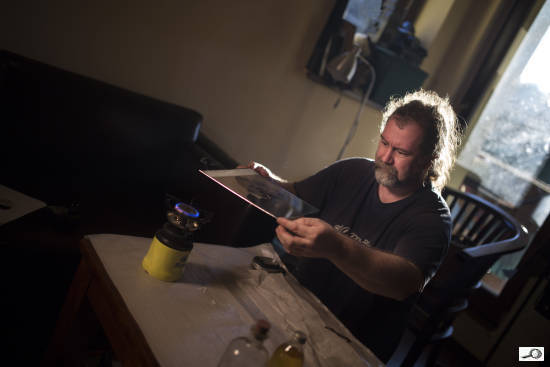 Celý proces je velmi složitý – popis najdete na webu, například na stránce Temnakomora.cz. Začíná přípravou kolodia, Richtr si ho připravuje i 14 dní dopředu – tuto vazkou tekutinu prezentuje nitrocelulózy rozpuštěné v lihu a éteru. Kolodium se dá koupit a před použitím se ředí etanolem a éterem. K němu se pak přidávají jodidy a bromidy – vzájemný poměr ovlivňuje vlastnosti citlivé vrstvy, citlivost a kontrast. Takto připravené kolodium se nechává odstát. Některé druhy jsou použitelné za pár hodin, některé zrají až několik měsíců. Před expozicí se kolodium naleje na desku: