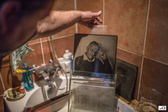 Následuje ustalování hotového obrázku. To už je vcelku bezproblémový proces a zde taky vidíte, jak ta fotka dopadla. A zde se dozvídám, proč je to mokrý proces? To kolodium, kdyby zaschlo, nepustí dovnitř vývojku. Bylo třeba historicky dalšího bádání a přišlo se na želatinu, která dokázala vpustit ke krystalům stříbrných halidů vývojku. A byl suchý proces na světě.