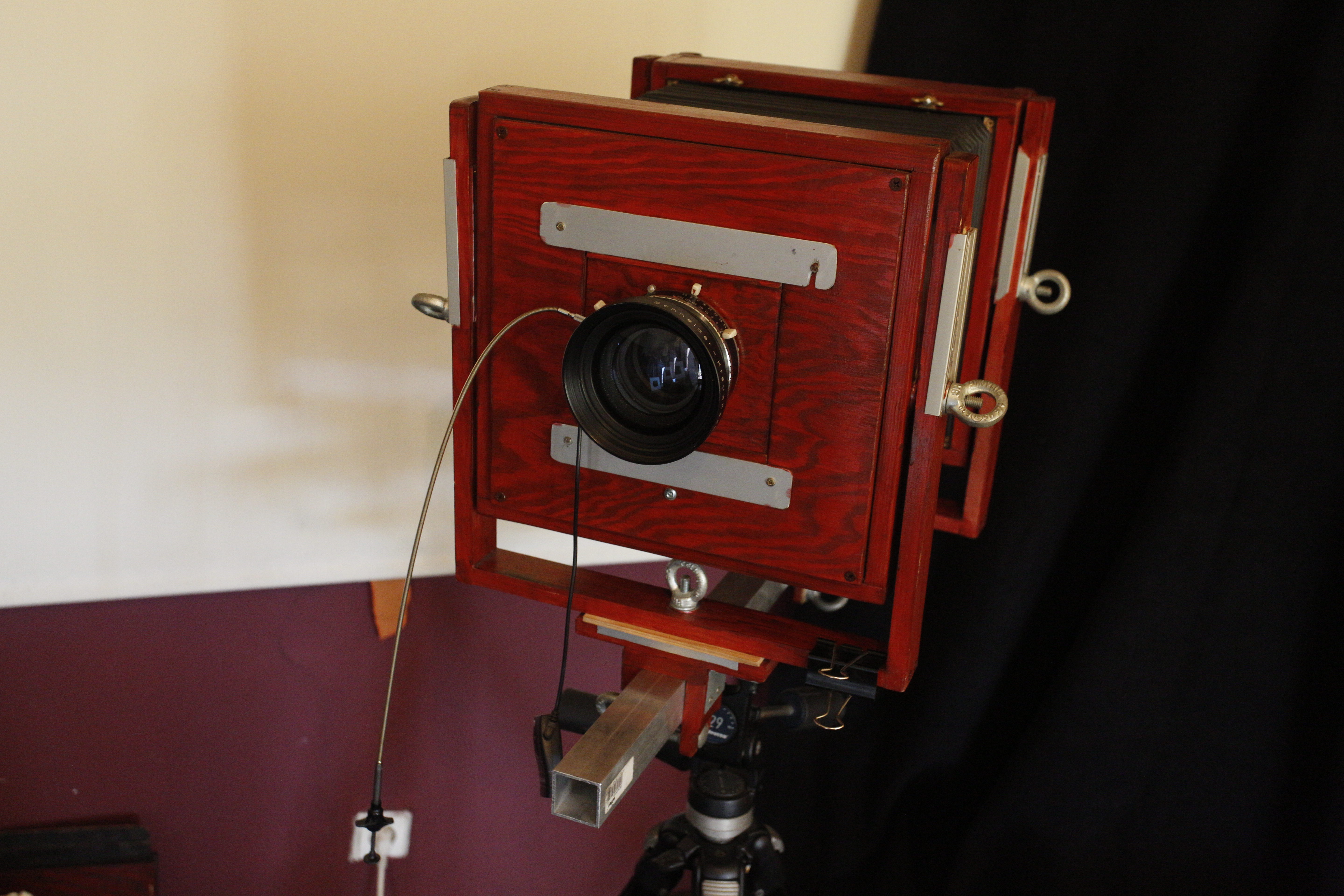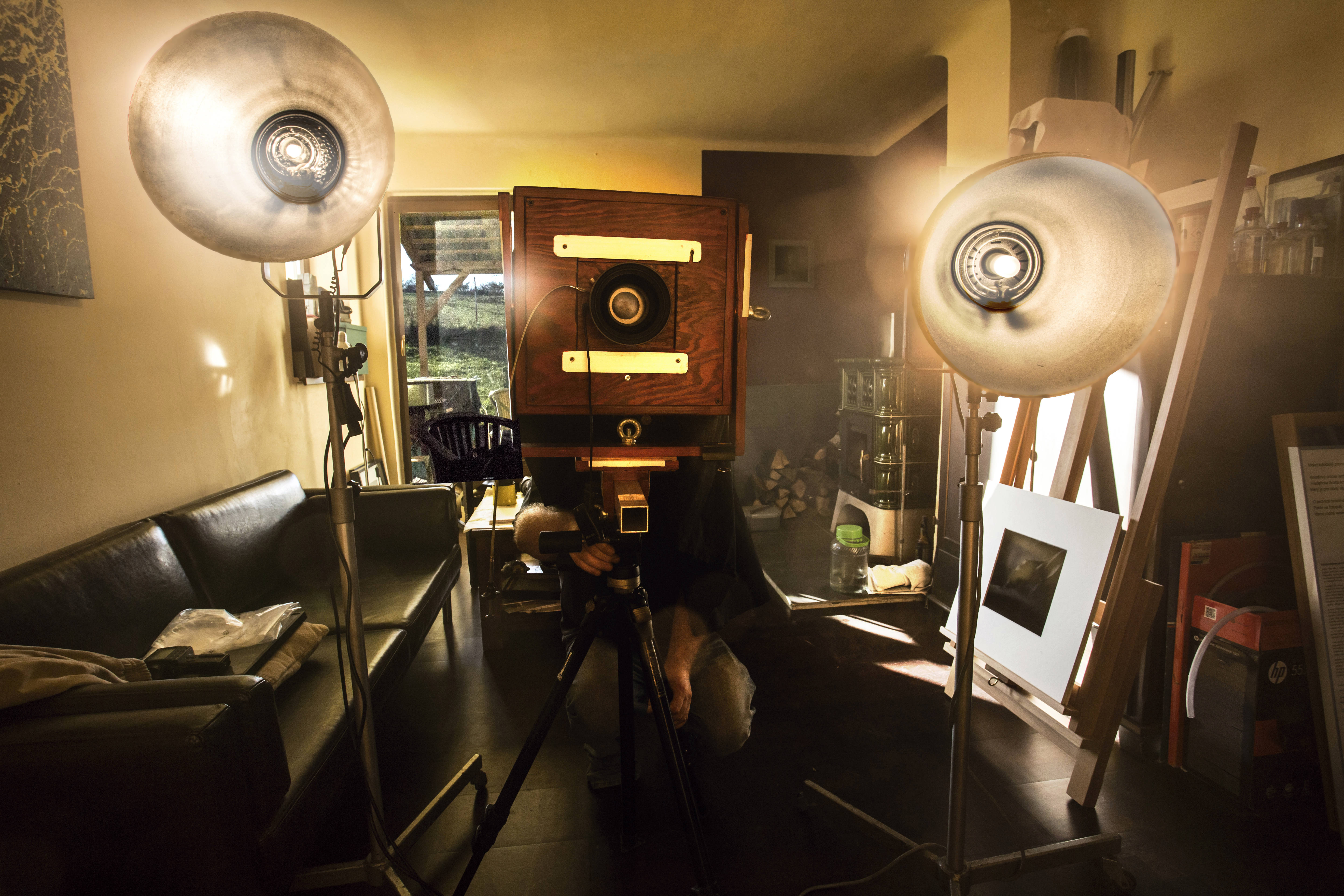 Standardní není ani zábleskové zařízení. Jde o speciálně postavené šestnáctistovky. Tak silný výboj je zapotřebí, protože citlivá vrstva Richtrových desek je citlivá jen na UV a modrou složku, jen za určitých okolností k zelené složce. Citlivost lze těžko odhadnout, ale je tak asi tři ISO.