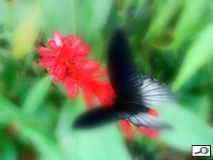 Černý motýl s červenými skvrnami přitáhl moji pozornost, když sedal na červenou kytku. Duplikoval jsem vrstvy a horní rozmazal Gaussovým, rozostřením. Pak následovala maska a černá barva nanášená měkkým štětcem odkryla ostrou kytku a jakž takž ostré žilky na křídlech.