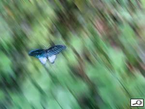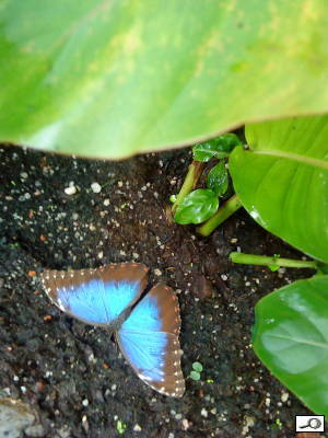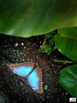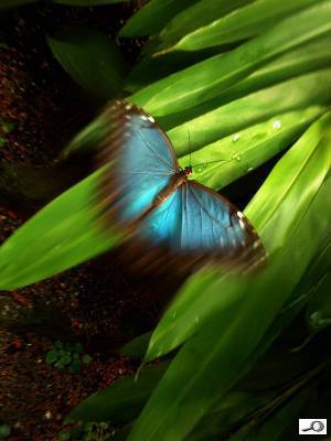 Tihle obrovští modří motýli jsou hlavní atrakcí! Zde mě zaujala jakási geometričnost – motýl jako trojúhelník ve vybrání listů. Duplikoval jsem vrstvy, prolnul režimem násobit a pomocí masky odkryl jasně barevného motýla.