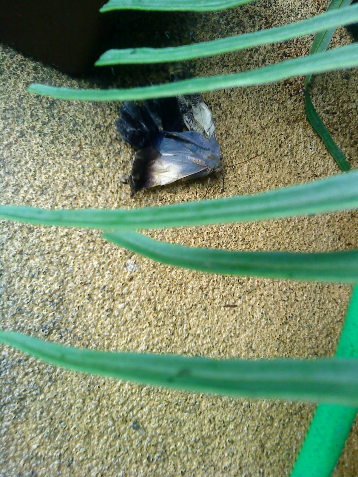 Druhý mrtvý motýl ležel v koutě, poblíž nohy skřínky, ve které se vylíhl – před hodinami, spíš před minutami. Díval jsem se na něho průhledem mezi čepelemi travin. Napadlo mě ty čepele zvýraznit zvýšenou sytostí a motýla světelně potlačit. Čepele jsem tedy přenesl do vrstvy, zvýšil jim sytost a rozostřil Gaussovým rozostřením. Spodek jsem ztmavil, jednak násobením a pak přemalováním velkým měkkým štětcem černou barvou.