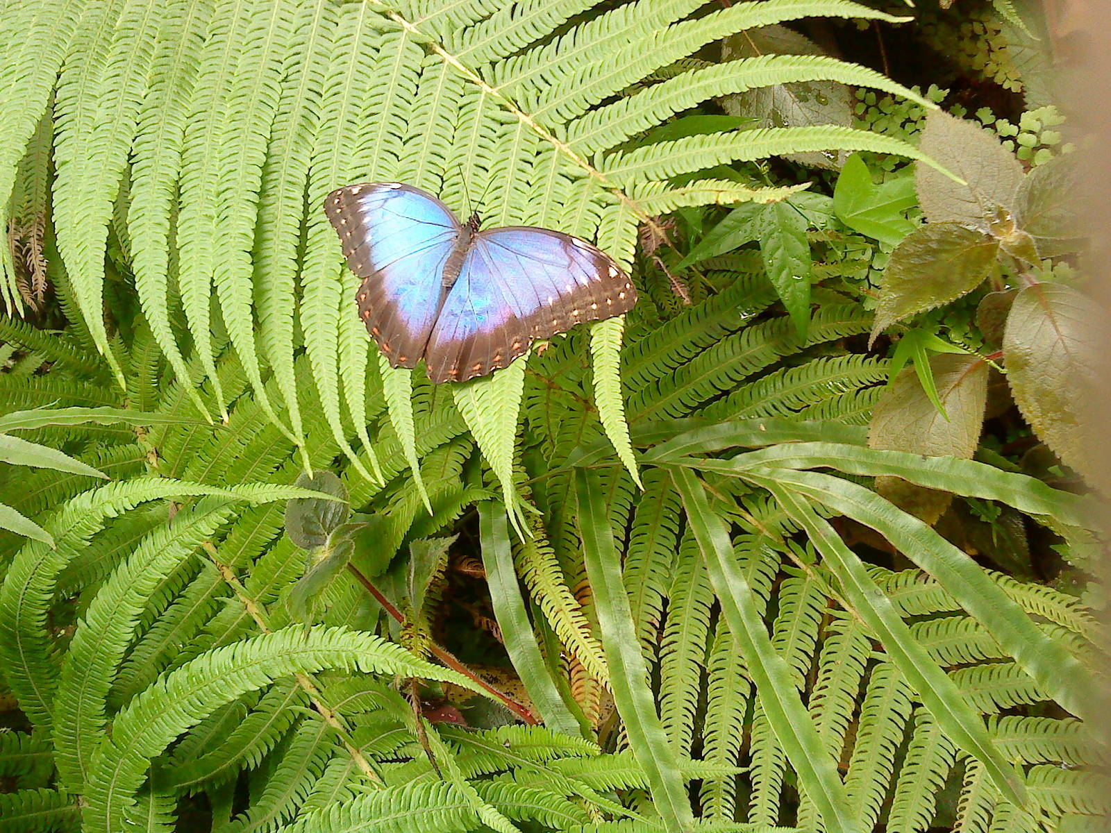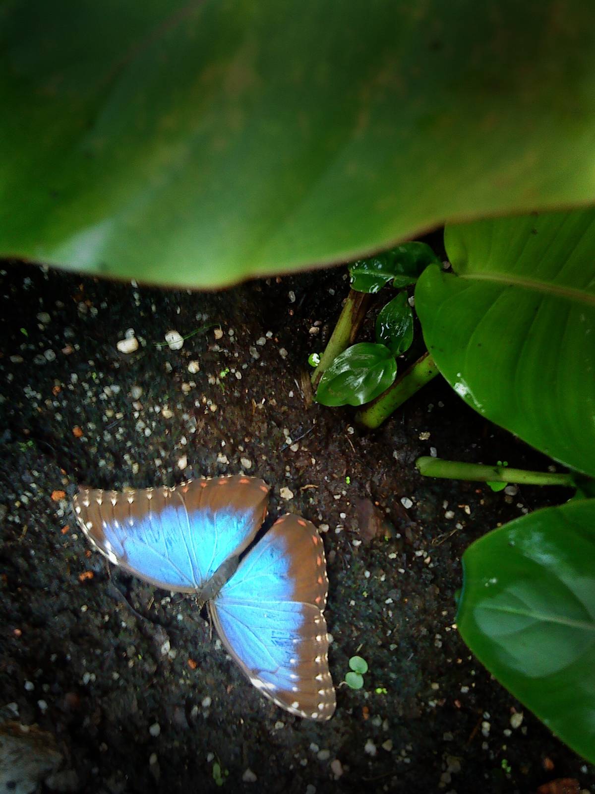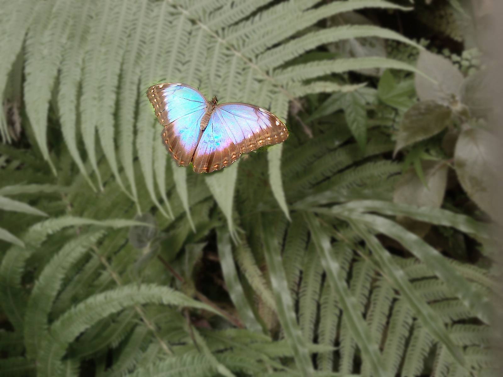 Tihle obrovští modří motýli jsou hlavní atrakcí! Zde mě zaujala jakási geometričnost – motýl jako trojúhelník ve vybrání listů. Duplikoval jsem vrstvy, prolnul režimem násobit a pomocí masky odkryl jasně barevného motýla.