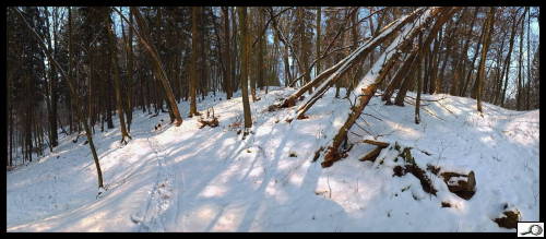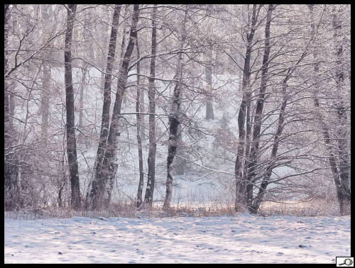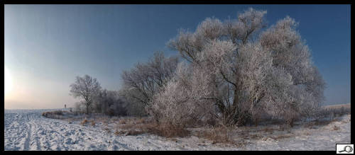 Ono to počasí má v posledních dnech své specifikum. Je sice čistá obloha, ale vzduch je jaksi zamlžený. Přineslo to jen jeden pozitivní efekt – za určitých okolností se ojínily stromy. Moc hezkou ukázku na Facebooku od Jana Tláskala, nazvanou Mrazivé plameny. Já to fotil jako panorama – Fujifilm X-S1 má stejný systém panorama jako X-10, jde o plynulé panorama a lze mu nadefinovat jednak šířku, od 120 do 360 stupňů, takže jsem volil 120, a směr pohybu kamery. Vždy volím „nahoru – dolů“, protože to umožňuje pohyb v poloze přístroje na výšku.