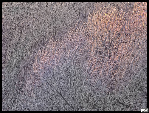 Tohle je varianta na tapetu, tentokrát ovšem focená maximálním ohniskem ekv. 640 mm. Hraju tady na kontrast šedivé a načervenalé barvy, ono to červené sluníčko část těch větví chytlo a zbarvilo. Rozhraní obou tónů tvoří úhlopříčku vedenou zprava nahoře dolů doleva.
