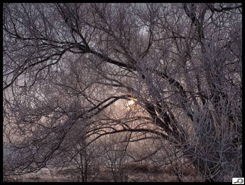 Zamlžený vzduch přinesl jednu výhodu, filtroval slunce. Takže se dalo fotit se sluncem v záběru. Zkusil jsem to skrz větve, ohniskem ekv. 24 mm. To ojínění dopadlo docela dobře.