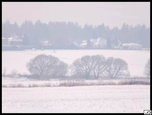 No a poslední ukázka má taky dva plány, stromečky a domečky. Ohnisko zase cca 200 mm. Nevadí mi, že to nemá černé, je to high key zimní krajina ani jsem s tím nemusel nic dělat, jen jsem vyretušoval všudypřítomné dráty vysokého napětí, tuto metlu krajinářské fotografie.