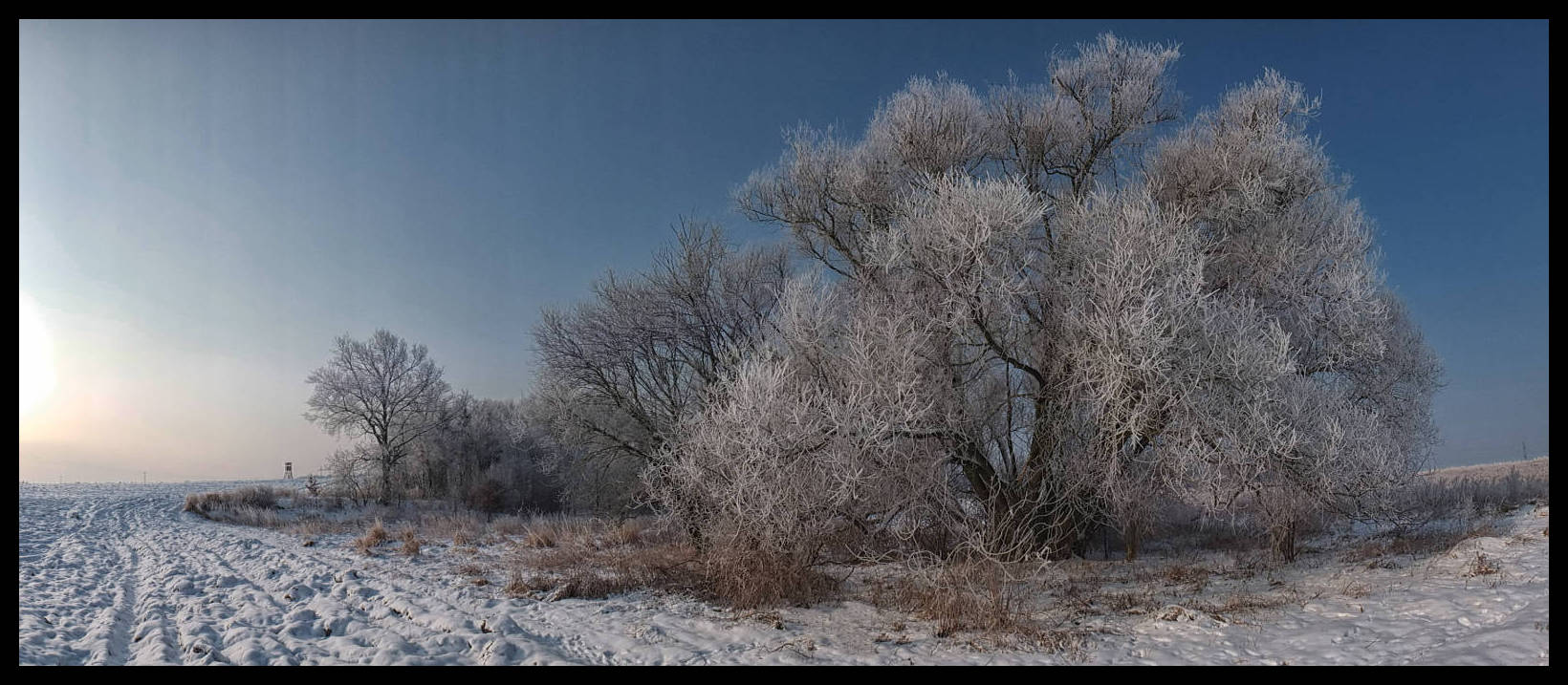 Ono to počasí má v posledních dnech své specifikum. Je sice čistá obloha, ale vzduch je jaksi zamlžený. Přineslo to jen jeden pozitivní efekt – za určitých okolností se ojínily stromy. Moc hezkou ukázku na Facebooku od Jana Tláskala, nazvanou Mrazivé plameny. Já to fotil jako panorama – Fujifilm X-S1 má stejný systém panorama jako X-10, jde o plynulé panorama a lze mu nadefinovat jednak šířku, od 120 do 360 stupňů, takže jsem volil 120, a směr pohybu kamery. Vždy volím „nahoru – dolů“, protože to umožňuje pohyb v poloze přístroje na výšku.