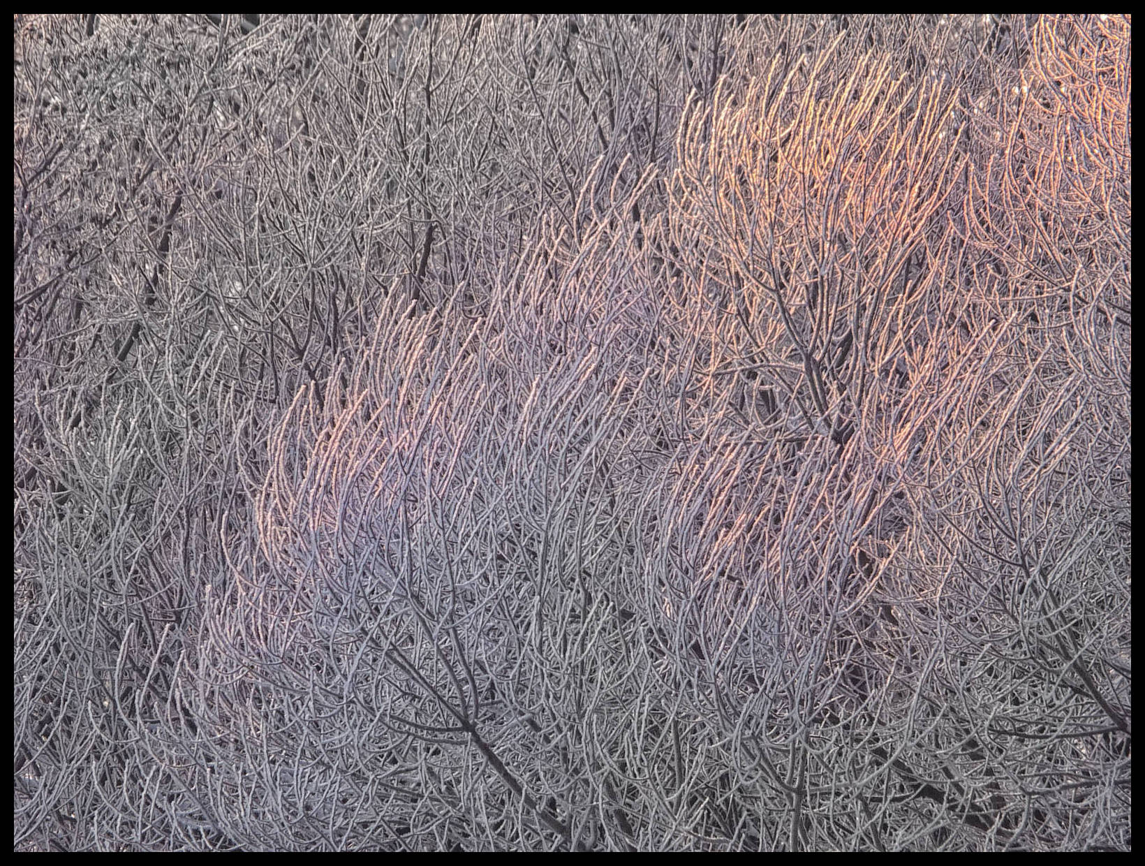 Tohle je varianta na tapetu, tentokrát ovšem focená maximálním ohniskem ekv. 640 mm. Hraju tady na kontrast šedivé a načervenalé barvy, ono to červené sluníčko část těch větví chytlo a zbarvilo. Rozhraní obou tónů tvoří úhlopříčku vedenou zprava nahoře dolů doleva.