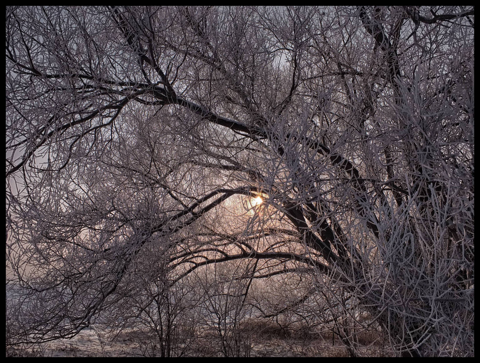 Zamlžený vzduch přinesl jednu výhodu, filtroval slunce. Takže se dalo fotit se sluncem v záběru. Zkusil jsem to skrz větve, ohniskem ekv. 24 mm. To ojínění dopadlo docela dobře.
