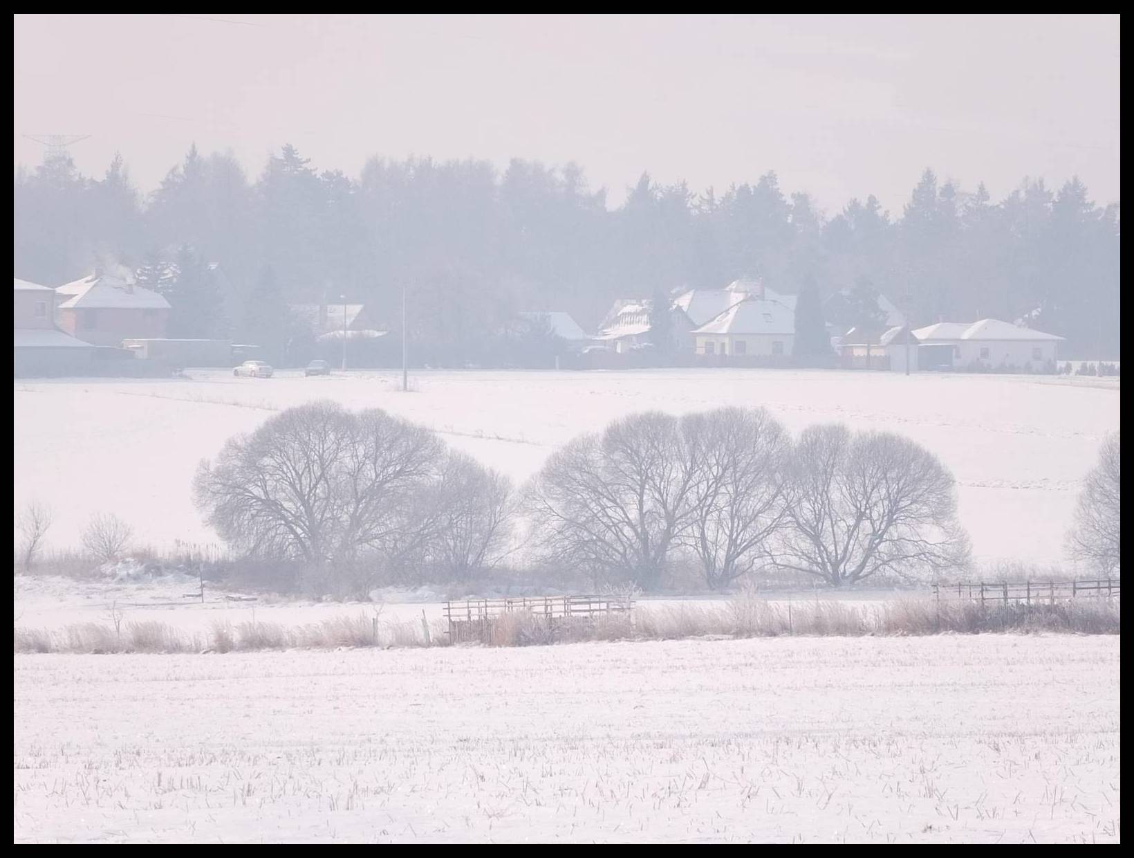 No a poslední ukázka má taky dva plány, stromečky a domečky. Ohnisko zase cca 200 mm. Nevadí mi, že to nemá černé, je to high key zimní krajina ani jsem s tím nemusel nic dělat, jen jsem vyretušoval všudypřítomné dráty vysokého napětí, tuto metlu krajinářské fotografie.