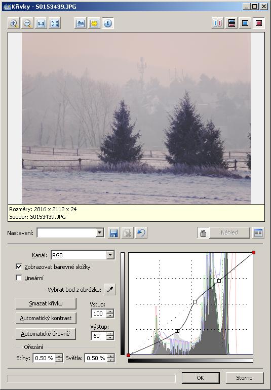 Tomuto obrázku jsem trochu pomohl ve křivkách, zde ukázka ze Zoneru. Křivka měla tři hrby, ten vpravo, to je vše světlé, prostřední ke plocha lesa v pozadí a levý hrbek patří smrčkům. Když si diagonálu upevníte nasázením uzlových bodů, můžete pak ovlivňovat jeden hrb nezávisle na druhých – zde jsem stáhnul ten levý dolů, abych smrčky zvýraznil. Ne vždy to jde, čím jsou hrby výraznější, tím větší je naděje na úspěch. Vyzkoušejte si to.