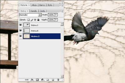 A už to sviští v mraveništi, šup s tím do Photoshopu nebo do jiného editoru, který má vrstvy (ono by se to dalo upachtit i v Zoner Photo Studiu: muselo by se jít odspodu, od spodní vrstvy k těm vyšším, začít pozadím, pak vyseknutým krmítkem až po vyseknutého holuba. V editoru s vrstvami se to pochopitelně dělá mnohem pohodlněji.