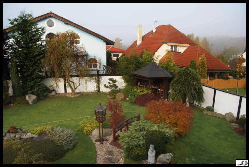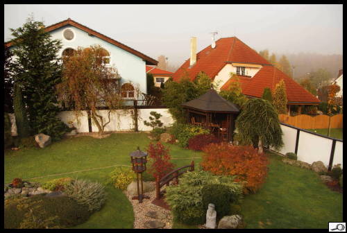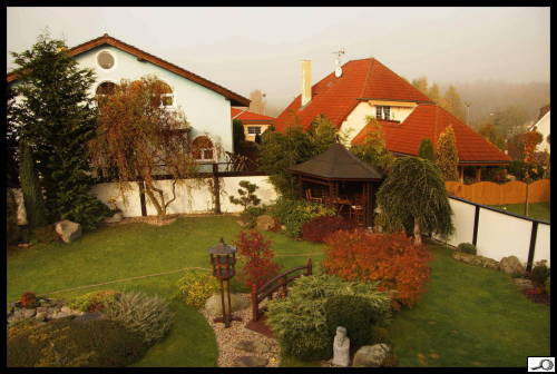 Dnes to vypadá jakž takž na sluníčko, zrána ale byla studená mlha. Jak podzimní barvy oteplit? Filtrem – zadarmo. Začnu pohledem z okna. Nastavím WB na automatické nastavení bílé a pořídím první snímek. Je takový hodně studený.