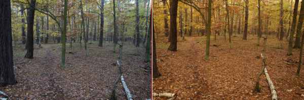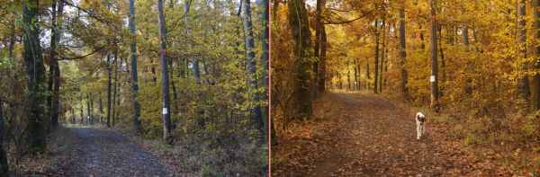 V praxi, tedy v podzimním lese, to pak vypadá takto, uděláme si nejdřív srovnání, vlevo automat, vpravo ruční nastavení bílé s odkazem na modrou oblohu.