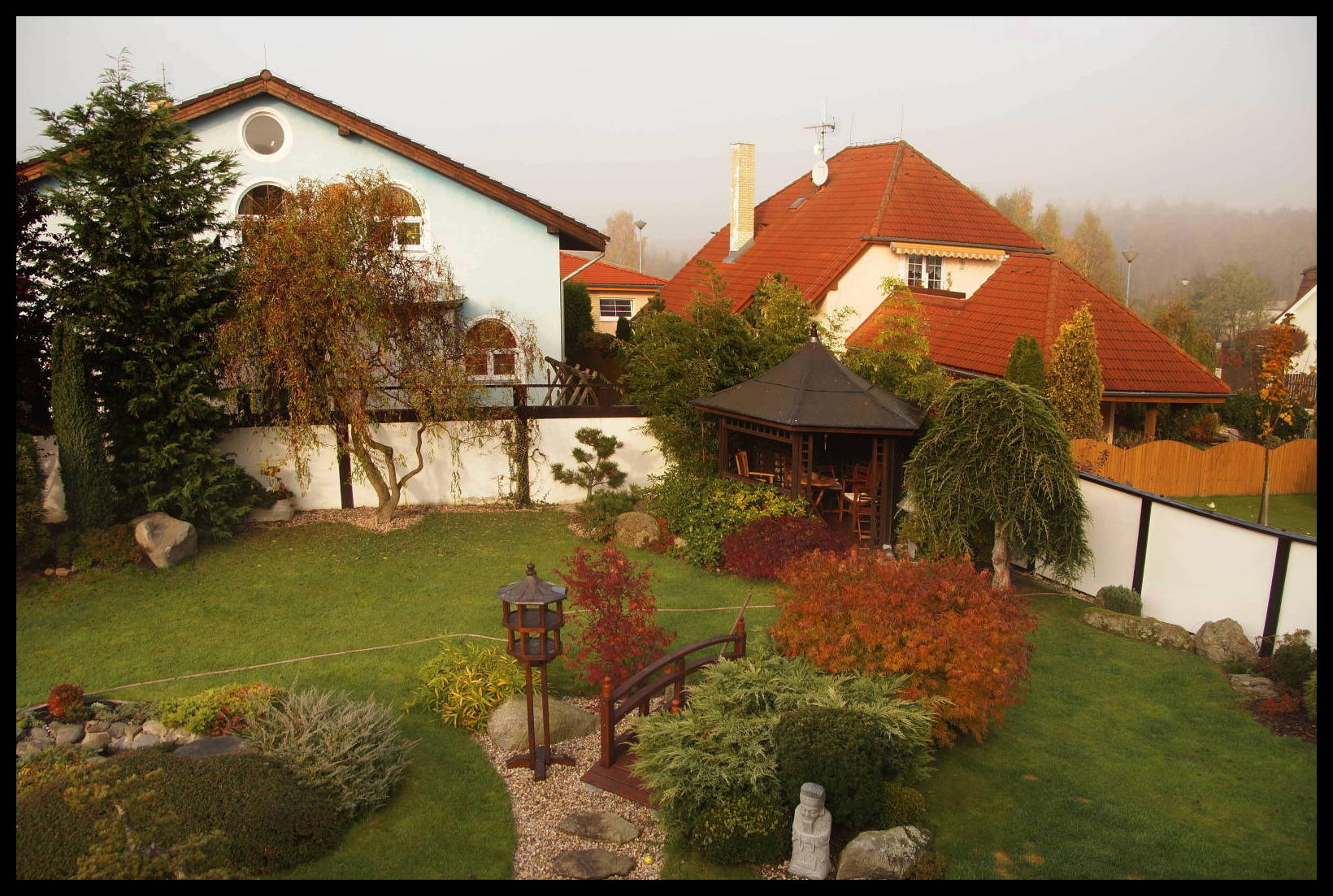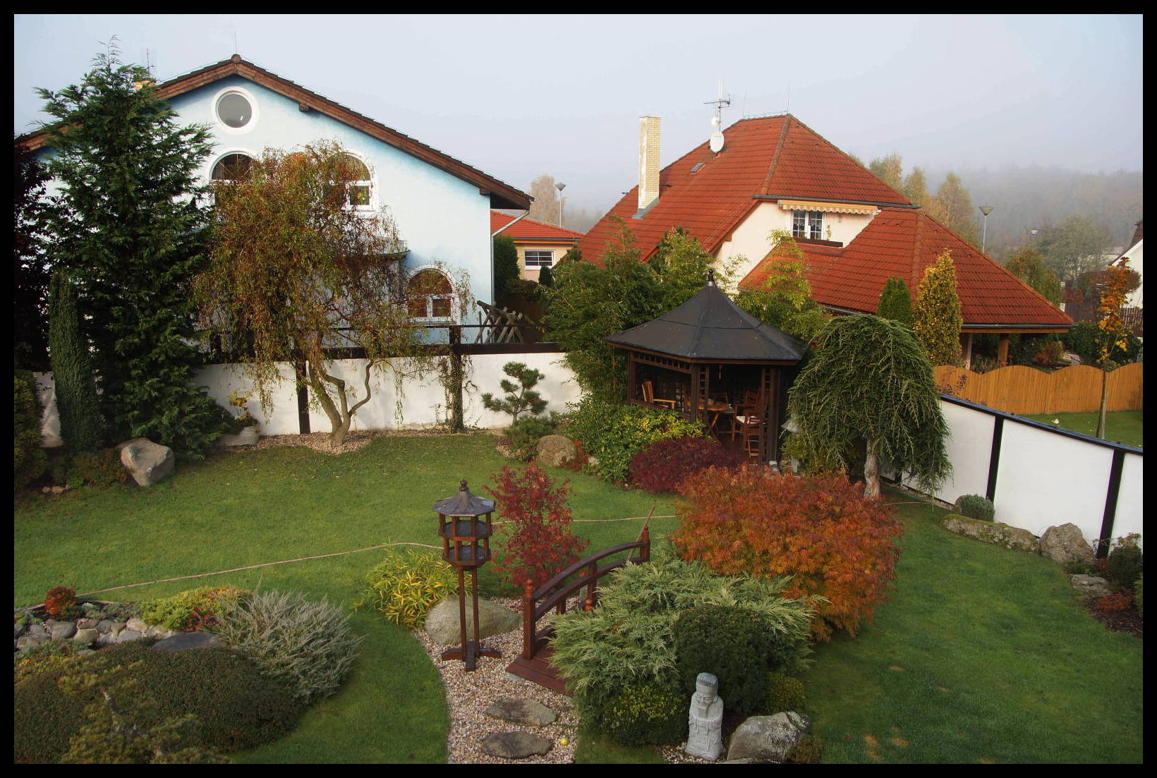 Dnes to vypadá jakž takž na sluníčko, zrána ale byla studená mlha. Jak podzimní barvy oteplit? Filtrem – zadarmo. Začnu pohledem z okna. Nastavím WB na automatické nastavení bílé a pořídím první snímek. Je takový hodně studený.