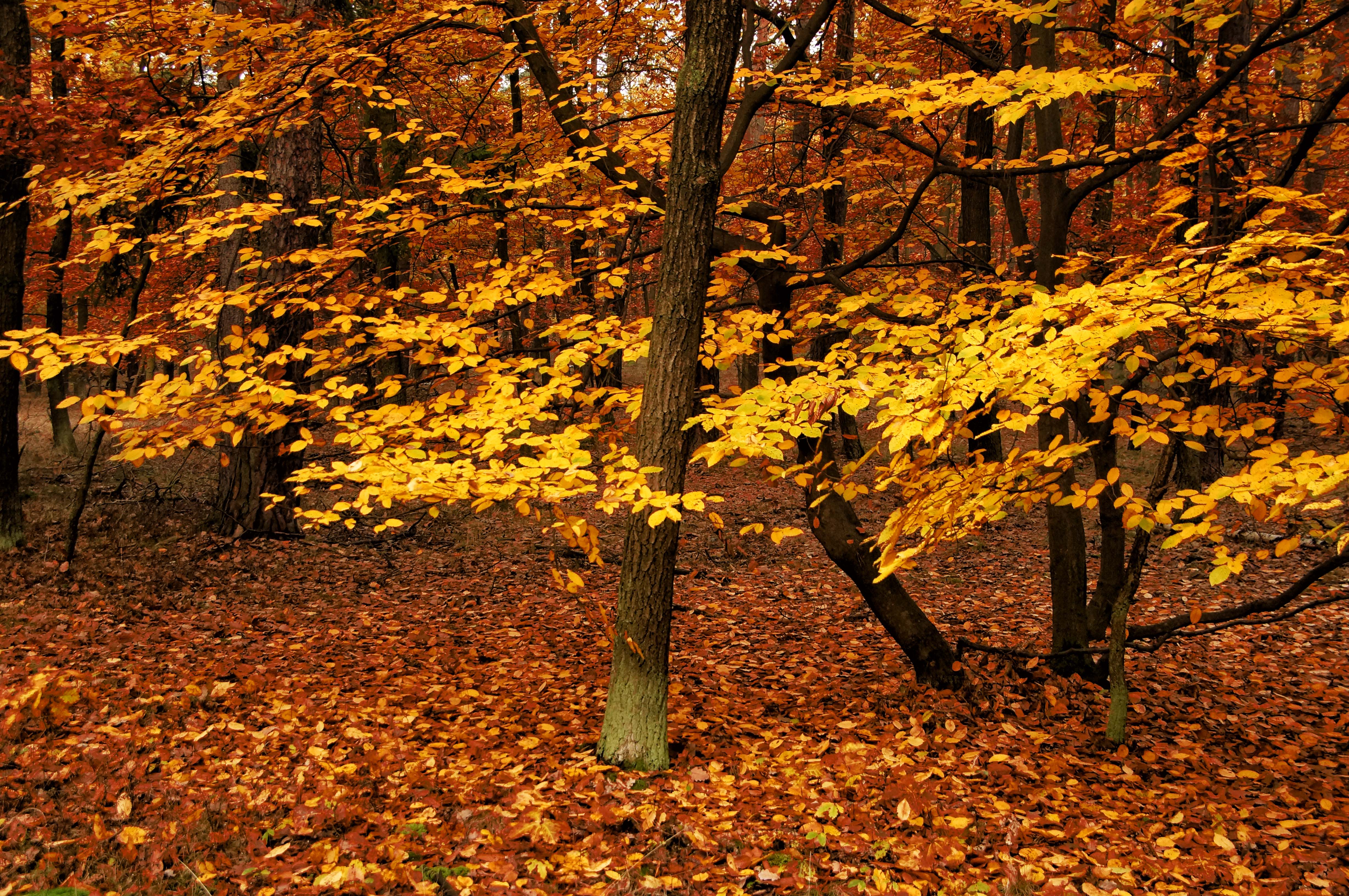 V praxi, tedy v podzimním lese, to pak vypadá takto, uděláme si nejdřív srovnání, vlevo automat, vpravo ruční nastavení bílé s odkazem na modrou oblohu.
