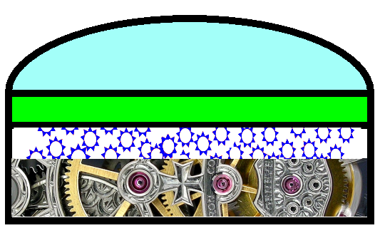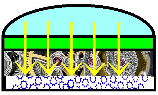 Shora je sběrná čočka, něco jako lupa – toto je výrobně nesmírně náročné zařízení a bylo publikováno, že vrstva čoček je výrobně nákladná jako celý zbytek zařízení pod ní.