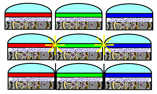 V druhé řadě jsou už blíž u sebe, ale dochází k průnikům světla z jedné fotodiody do druhé (žluté hvězdy).