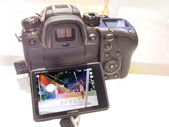 Tělo přístroje vyhlížejícího jako zrcadlovka je z hořčíkové slitiny, utěsněné proti vlhkosti a prachu. Displej je třípalcový dotykový AMOLED, elektronický hledáček je 2,4 megový AMOLED. Na horní stěně je stavový displej, uvnitř je wi-fi i Bluetooth. Už asi nepřekvapí, že USB je třídy 3.0. Stánku Samsungu v hale 5.2 tento model právem vévodí.