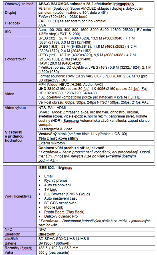Řada objektivů NX se rozšiřuje o nový typ špičkových profesionálních objektivů 50-150mm 2.8 S ED OIS. Objektiv nabízí světelnost F2.8 v celém rozsahu ohniskové vzdálenosti 77-231mm (35mm ekvivalent). Díky tomu je tato víceúčelová řada objektivů s označením S vhodná pro mnoho různých scénářů včetně sportu, divoké přírody a portrétní fotografie. Další vlastnosti včetně stabilizačního systému Advanced Multi-Axis Optical Image Stabilization (OIS) s až o 4,5 kroky (ve střední řadě, pod standardy CIPA), Samsung Ultra Precise Stepping Motor (UPSM) a odolnosti vůči prachu a stříkající vodě nabízí Samsung Hyper Shield (SHS). Více informací naleznete na www.samsungmobilepress.com. Oficiální video můžete shlédnout zde: www.youtube.com/samsungcamera Technické specifikace NX1