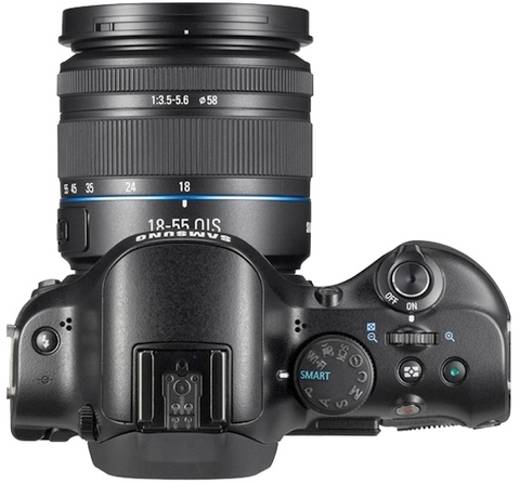 Přístroj se zapíná páčkou u spouště, je velmi inteligentně řešena, snadno ji nahmátnete, avšak nehrozí samovolné spuštění. Na horní stěně pak je kruhový volič s režimy PASM, tedy program, priority času a clony a plný manuál. Pak nastupuje specialita Samsungů, totiž priorita objektivu.