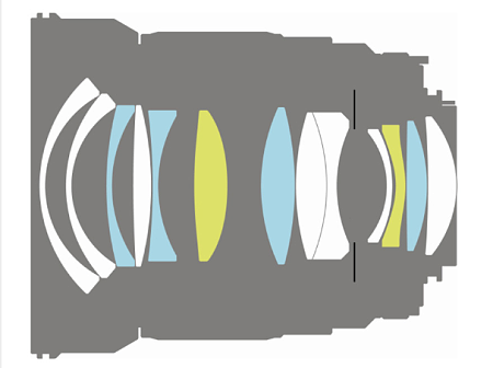 Objektiv má 13 členů ve 12 skupinách, dvě čočky jsou asférické (ty žluté) , 4 jsou ze speciálního nízkorozptylového skla.
